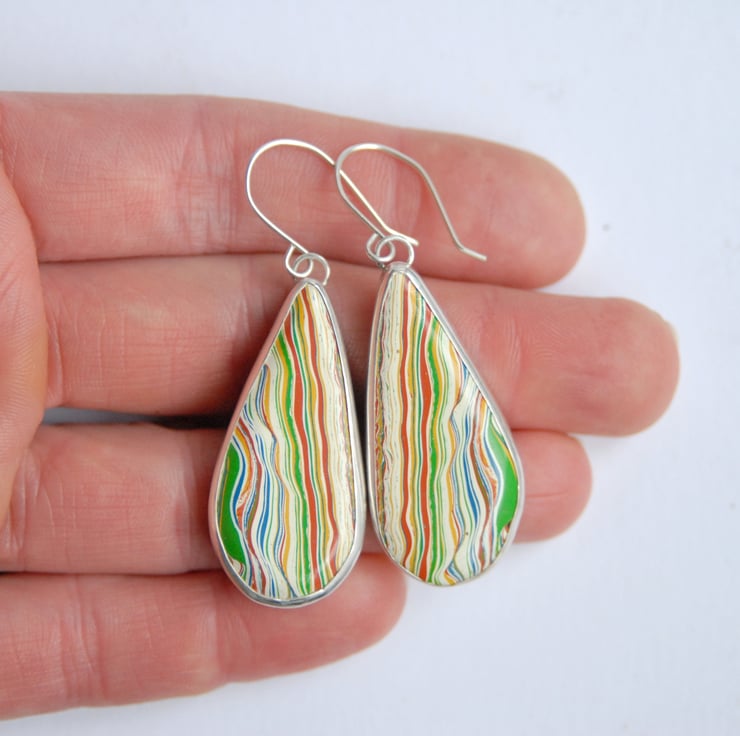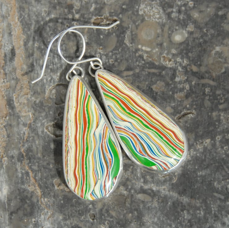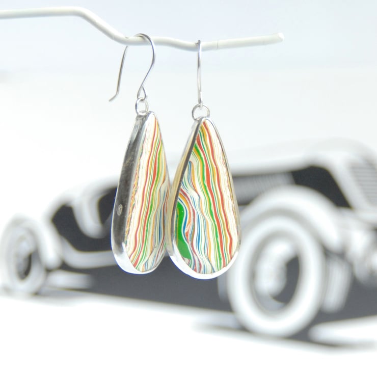 These drop earrings have real retro appeal as they are made with vintage boatite which has been bezel set in sterling silver and finished with simple silver hooks. Boatite is a build up of cured paint from boat yards, in this case the Larson boat yard and this material is believed to be from the 1960's hence the retro colour palette of creams, tans, green and mustard. These have a more stripey pattern which gets more wavey across the earring. The earrings measure 55mm drop (inc hook) by 19mm across, boatite is lightweight so they are not heavy in the ears and could comfortably be worn all day. Comes gift boxed.