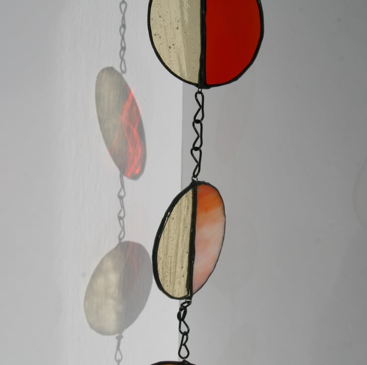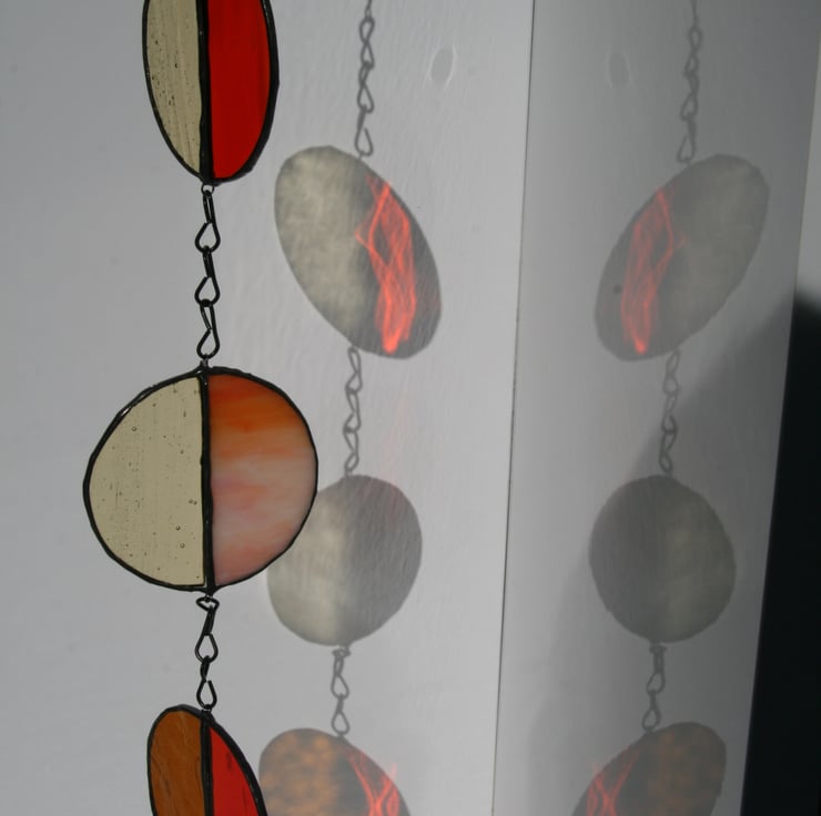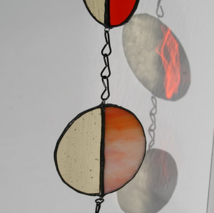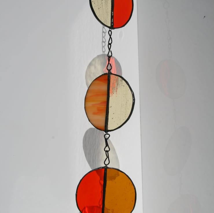 Using tones of red, orange and amber, the circles are created using the copper foil techniques. The glass is hand cut, wrapped in copper foil and soldered together leaving a nice smooth bead. The solder is treated with a black patina and then polished to a sparkling shine.