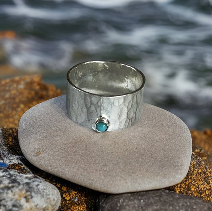 A handmade sterling silver ring is exquisitely crafted, measuring 10mm in width.I have given this ring a hammered finish creating charm and character to the ring