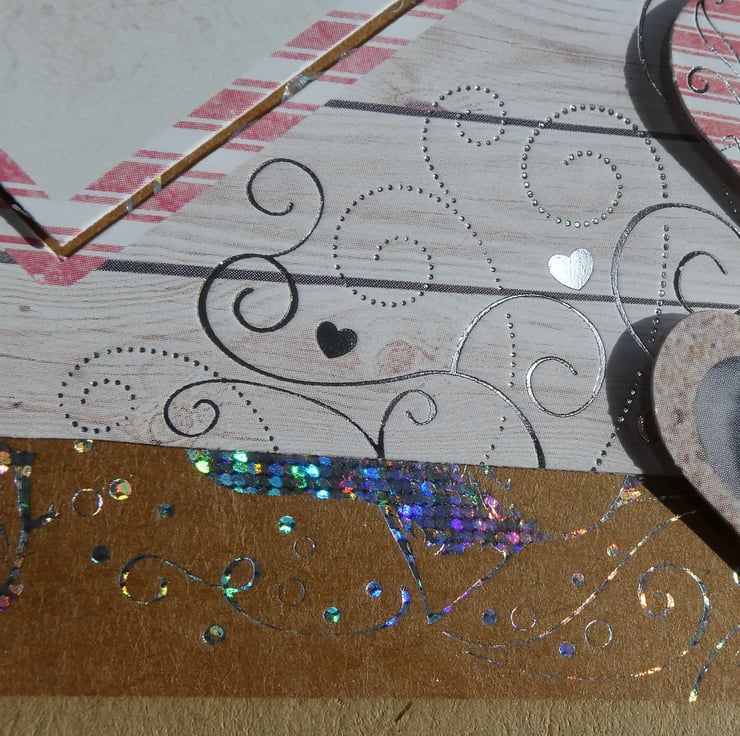 To finish the design 3 small card heart shapes have been added to the right hand side. One pink and white striped and 2 in neutral tones with dark grey centres. All have silver foiled detail and one has the message 'With Love'.