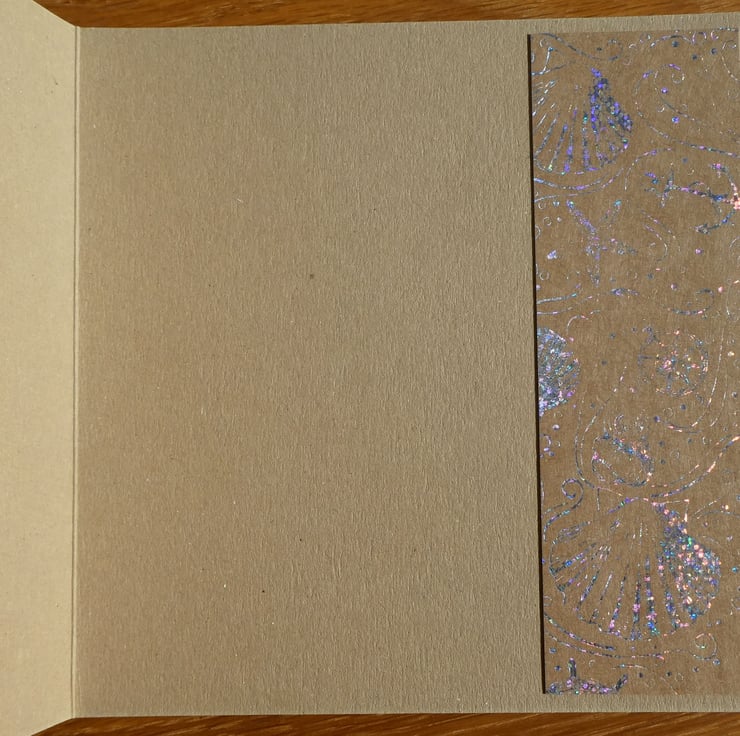 Down the right hand side of the Inside of the card is a strip of the same kraft card with holographic foiled images, leaving space for your own message.
