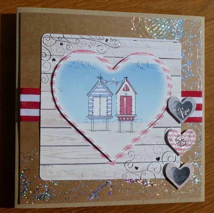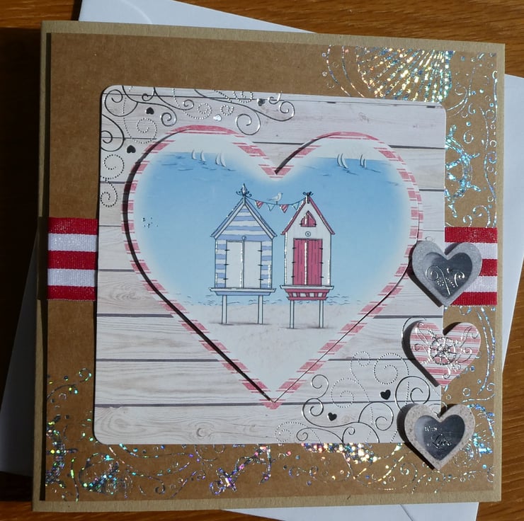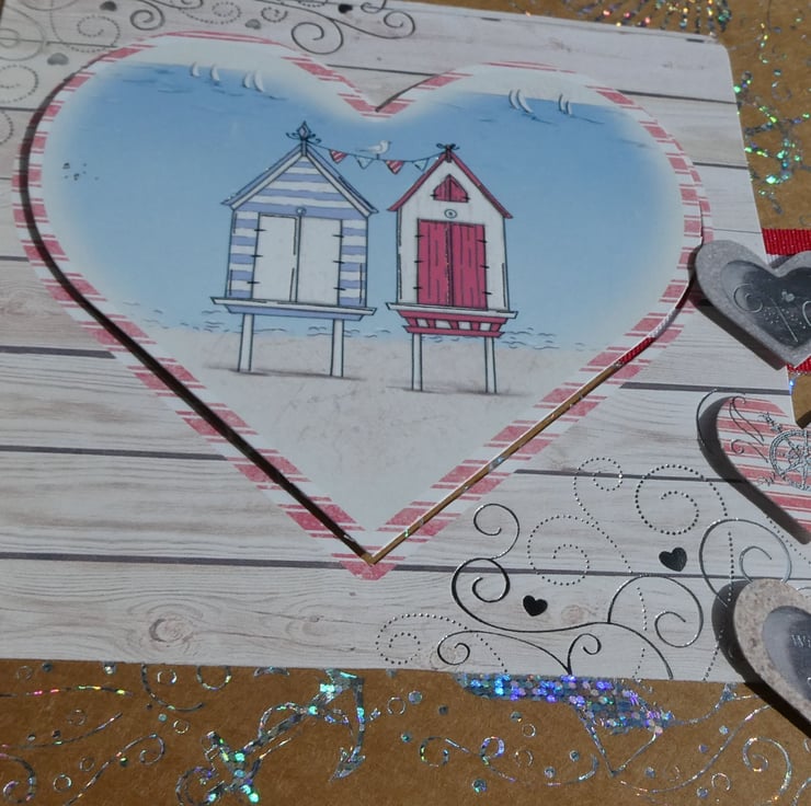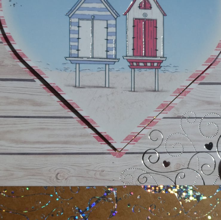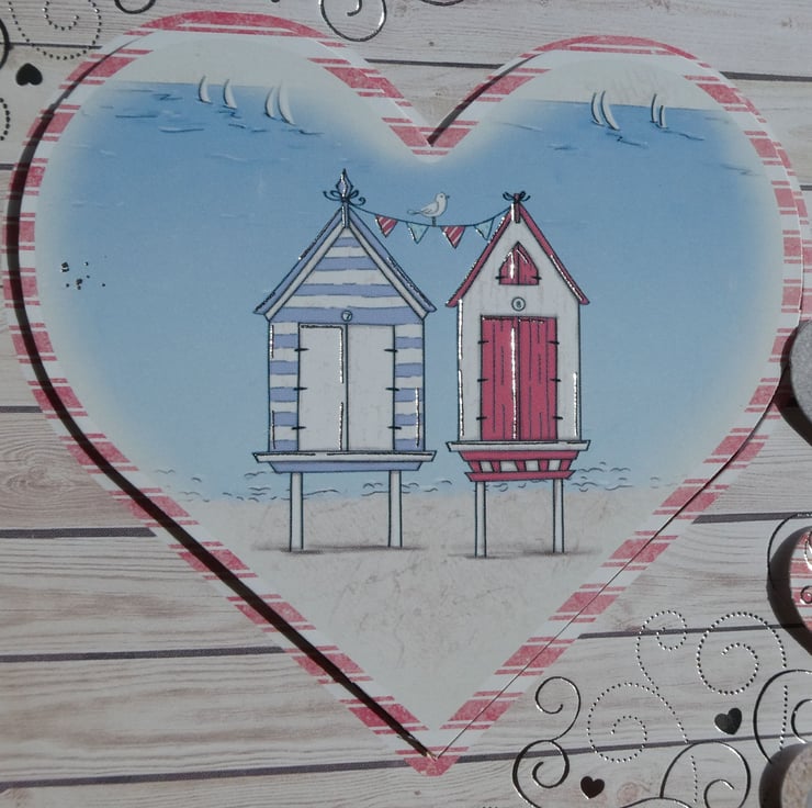 A central heart shaped printed image of two beach huts on stilts with bunting, sailing boats and a gull is slightly raised on foam pads. This has been framed with a square of card, printed with a distressed whitewashed wood background with swirls and hearts in silver foil.