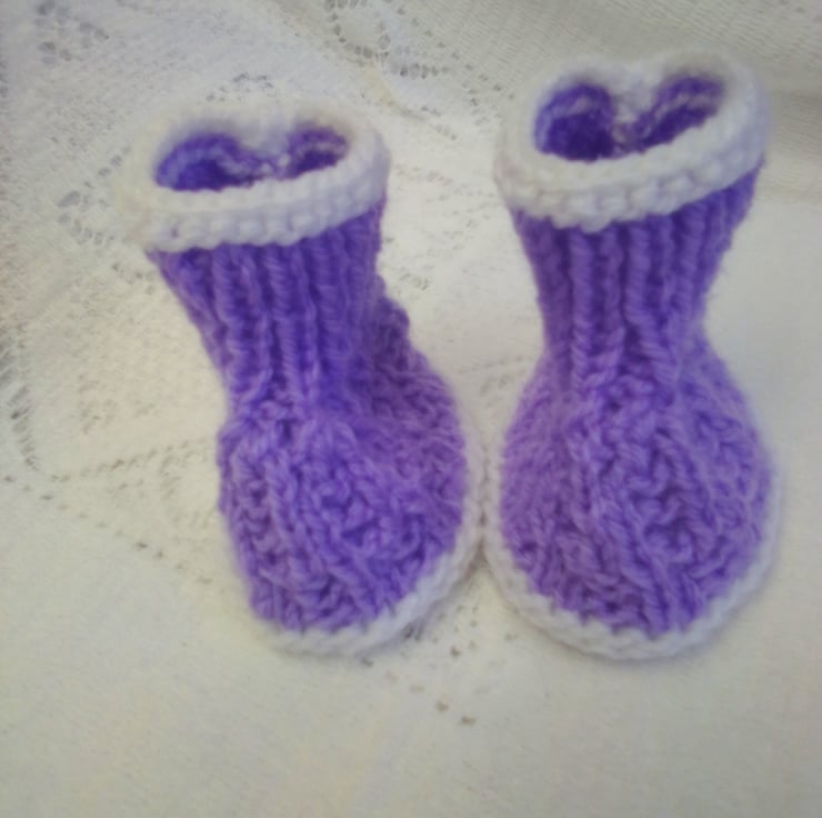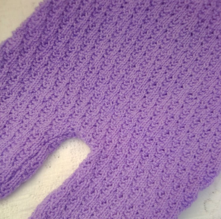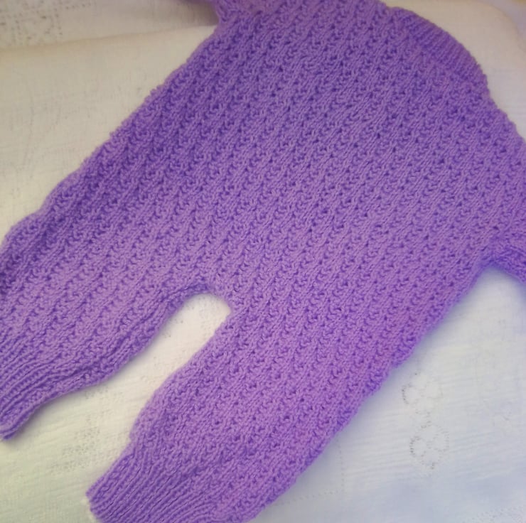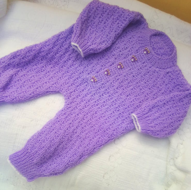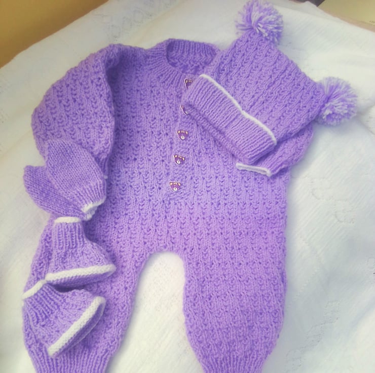 The outdoor outfit would make an ideal gift for a baby shower, a new baby, for Christmas or as a Christening gift. It would also make a lovely gift for a new premature baby. The hand knitted set for a comprises an All in One, a pom pom hat, a pair of mittens & a pair of booties.The set is in stock in the lilac colour with the white edging shown, to fit a newborn baby with a 14 inch chest. The all in one is fastened at the front by 5 wooden purple teddy bear buttons and the hat has two fluffy lilac and white pom poms at the top corners.