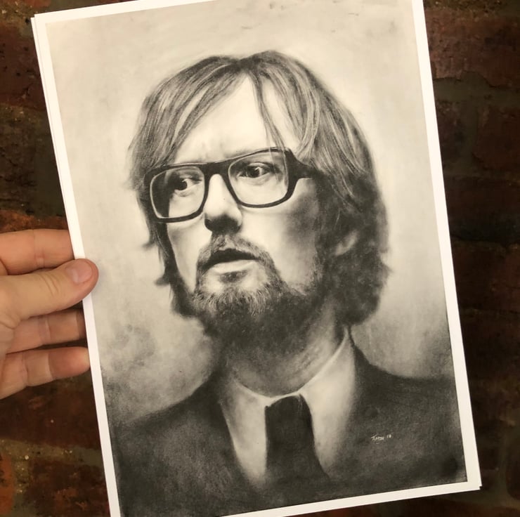 Print of my charcoal drawing of Pulp singer Jarvis Cocker. Printed on quality 230gm paper. This will be posted in a flat cardboard envelope or the larger A3 size in recycled cardboard tube.
