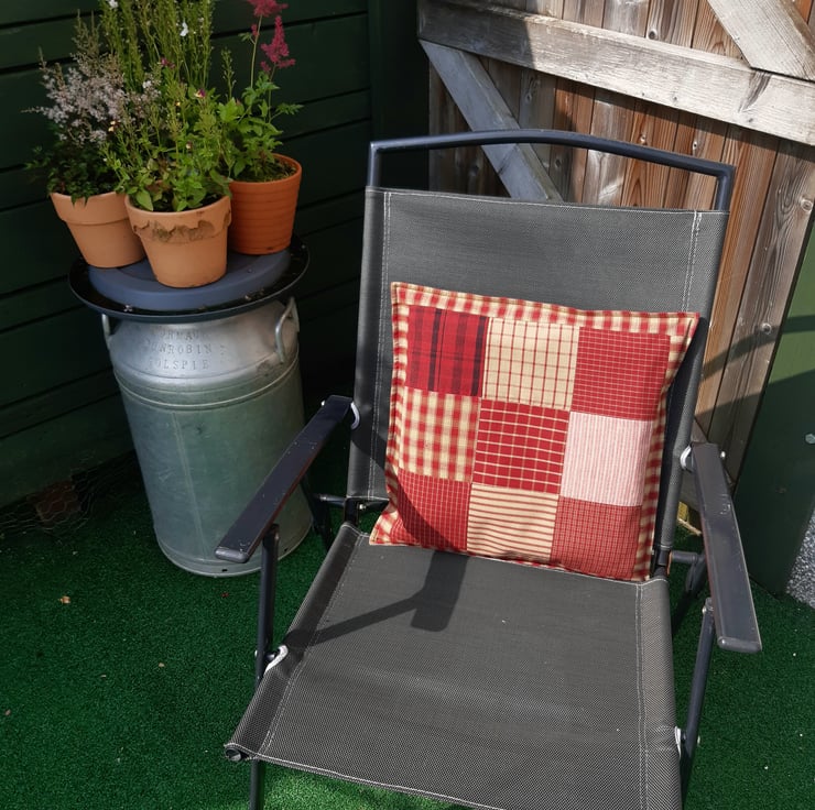 Made using Homespun cotton fabric in various shades of reds. Homespun fabric is exceptionally soft to the touch, is 100% and washes up a treat (cool wash - light iron). The squares have been sewn on to wadding. This gorgeous cushion cover will make a fabulous addition to your home. The reverse has been made using both red and off white cotton fabric with an envelop opening making it easier to insert your preferred cushion (cushion insert not provided). ONLY ONE AVAILABLE.