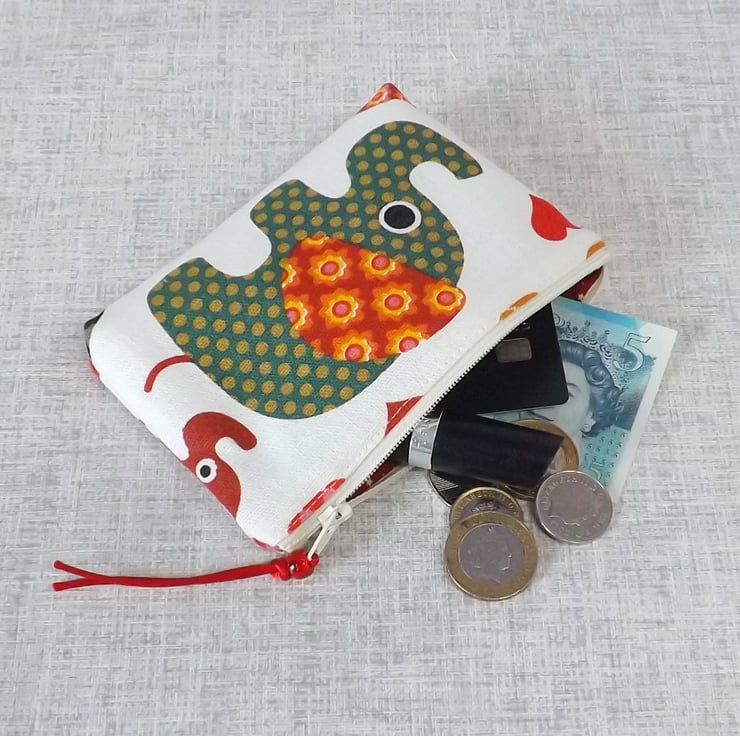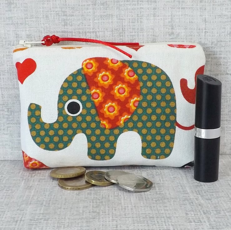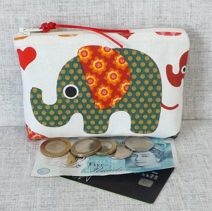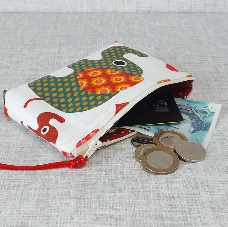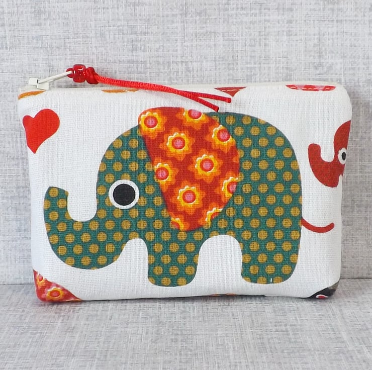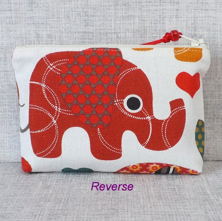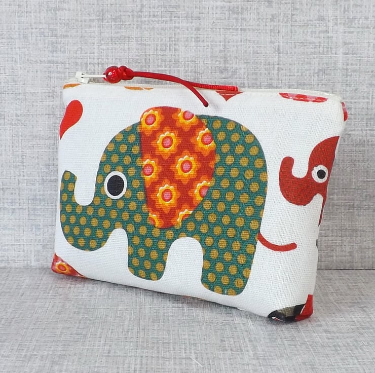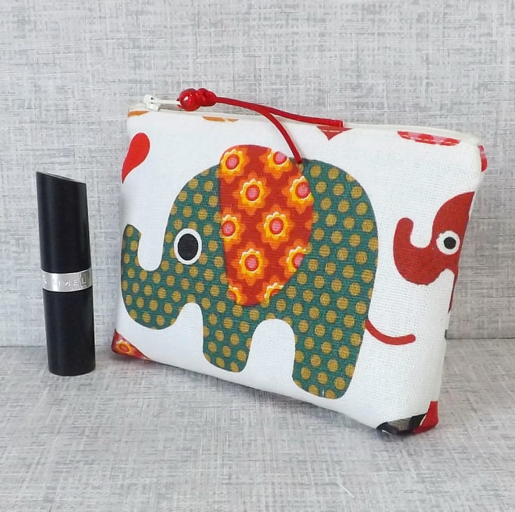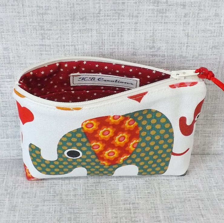 A medium size coin purse made from cotton canvas fabric with an elephant design in shades of red, green and orange, on an off white background. The lining is a red cotton fabric with off white small stars on. There is a pocket inside for a credit/debit/store card or some notes.
