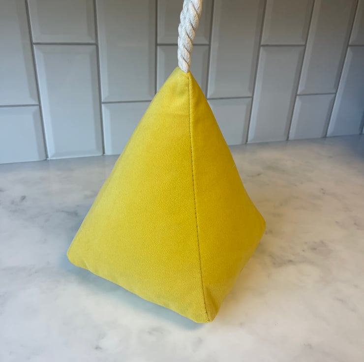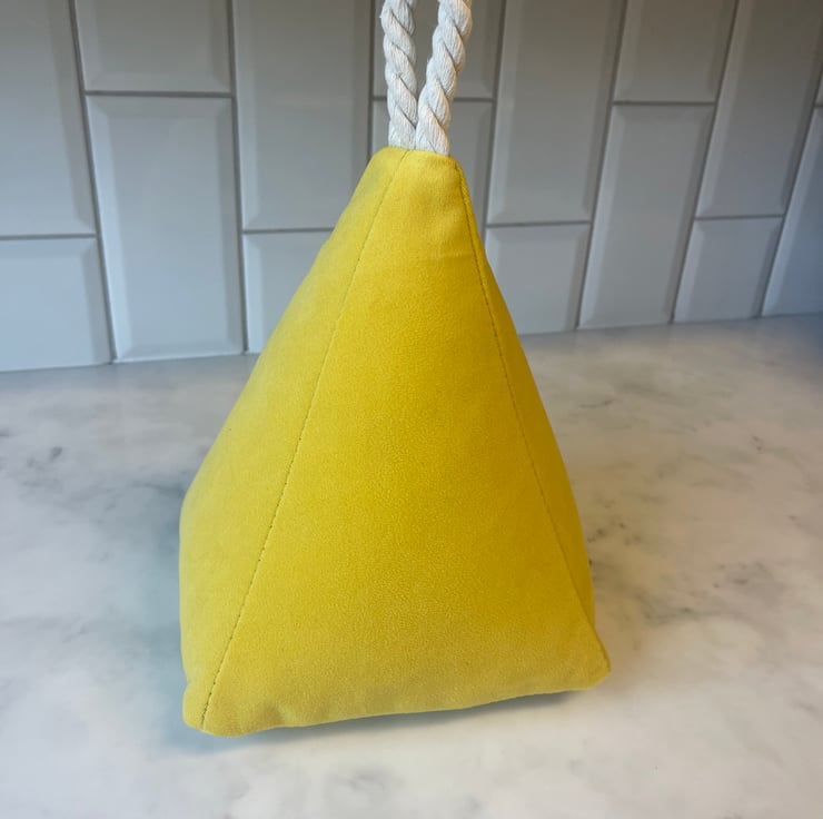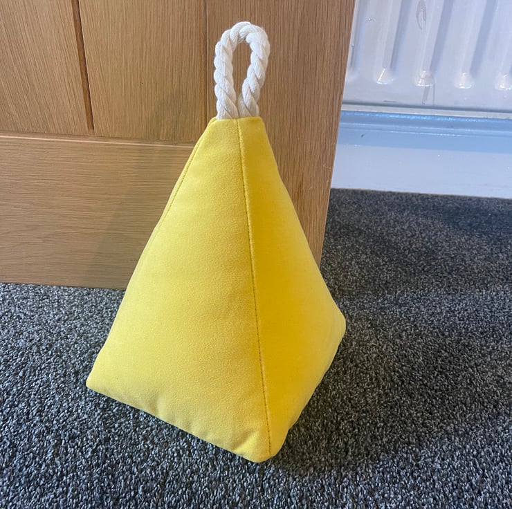 Beautiful hand made Sunshine Yellow plush velvet door stop with rope handle to make it easy to move around this door stop can come filled or empty with a zip at the bottom for you to fill with your choice.
