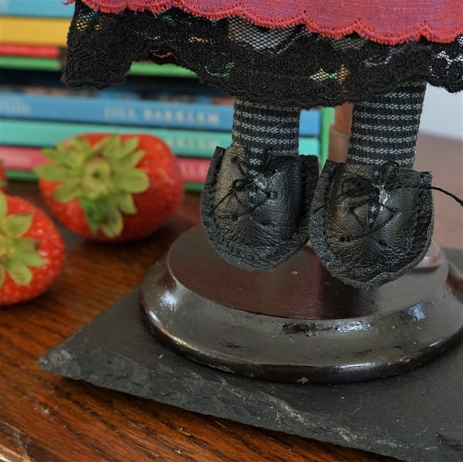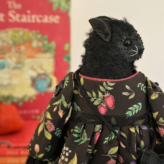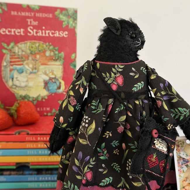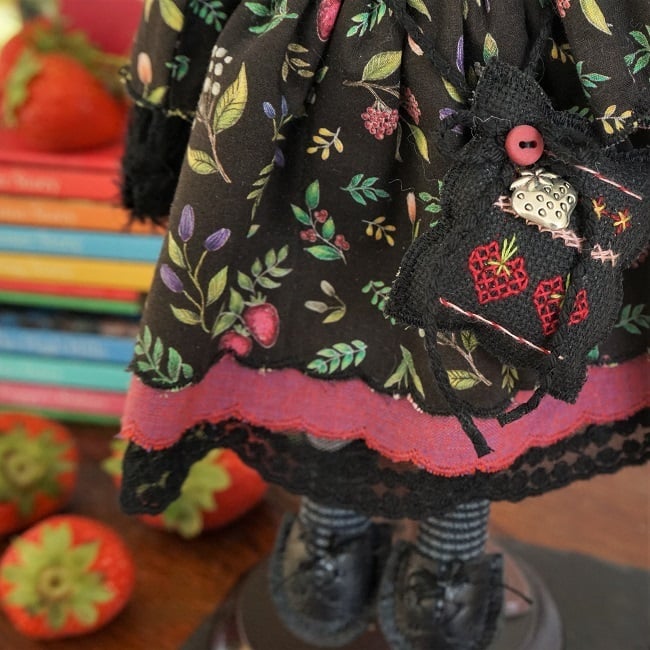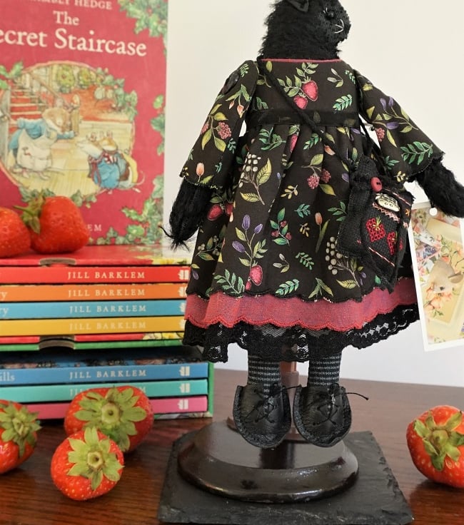 This is Brendal, a tiny midnight mohair mouse. She is a hand embroidered mouse with little leather ears and tail. She is dressed in a pretty midnight Liberty Lawn called Little Berry with strawberry fruits and flowers abounding. She has coordinating underskirts in red shot cotton with black tulle lace and cotton lace bloomers. Her dress is finished with organza ribbon, tiny buttons and little leather shoes.