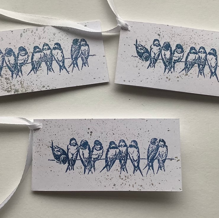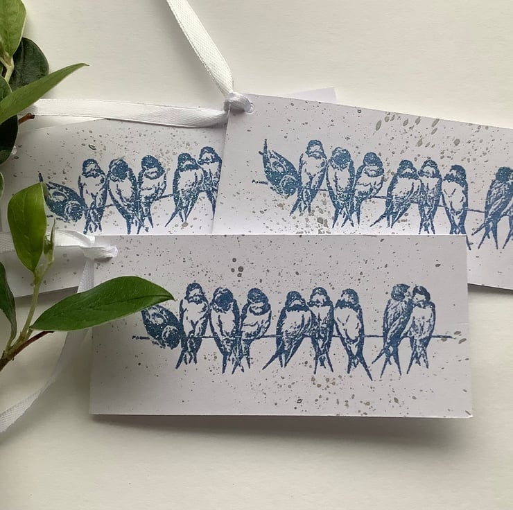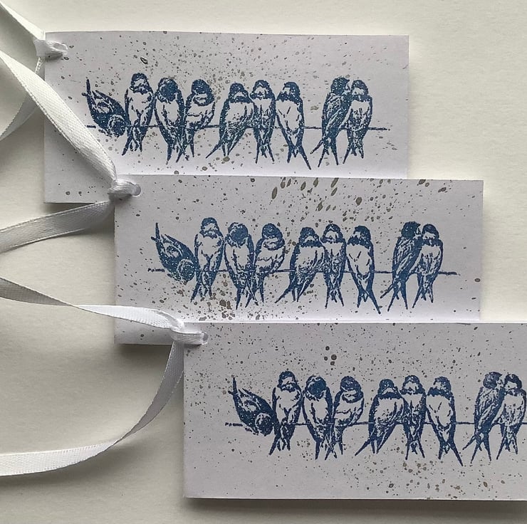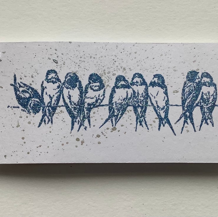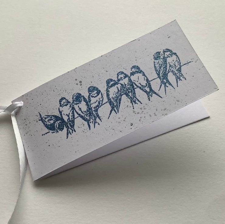 Hand stamped ' Swallow / Bluebirds on a wire ' image, in blue ink with a smattering of silver metallic inks on the background . I've used high quality (300gsm), white card for a clean look . Finished with white ribbon .