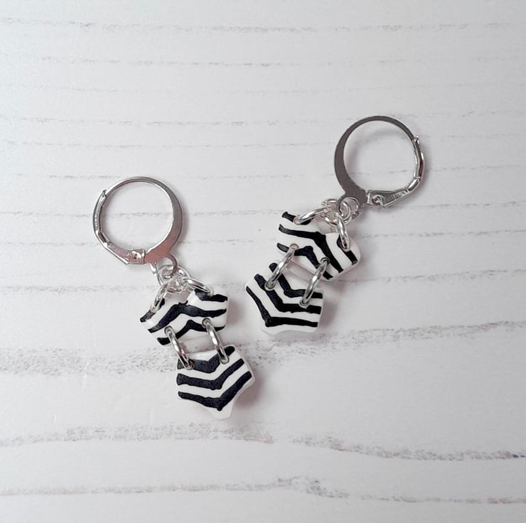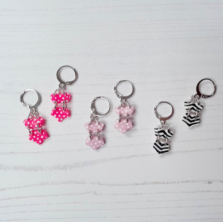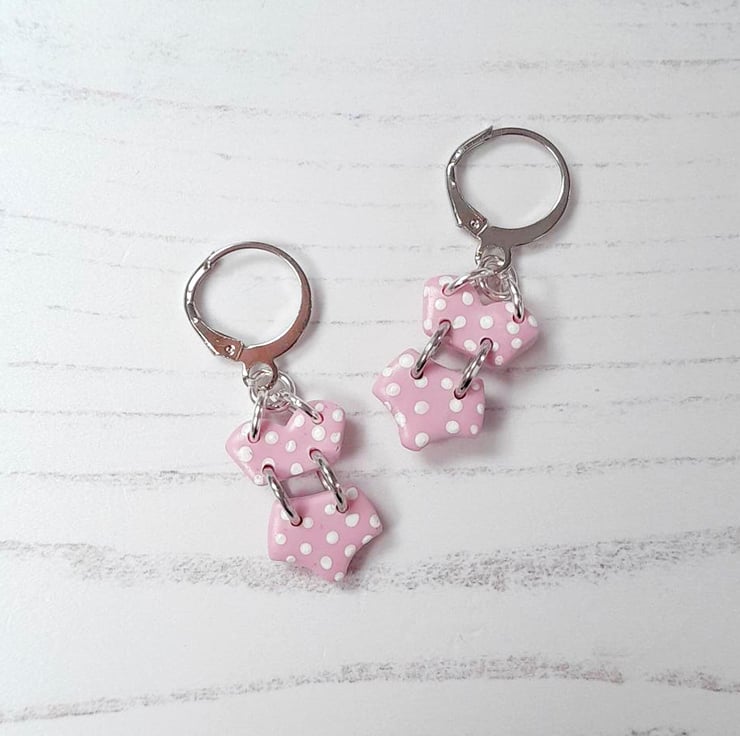 These cute bikini style earrings have been carefully hand crafted using polymer clay in the shape of a two piece bikini, with detail added using acrylic paint then sealed with gloss. The earrings are then fixed onto silver plated mini 'huggie' hoops using jump hoops for a drop effect!