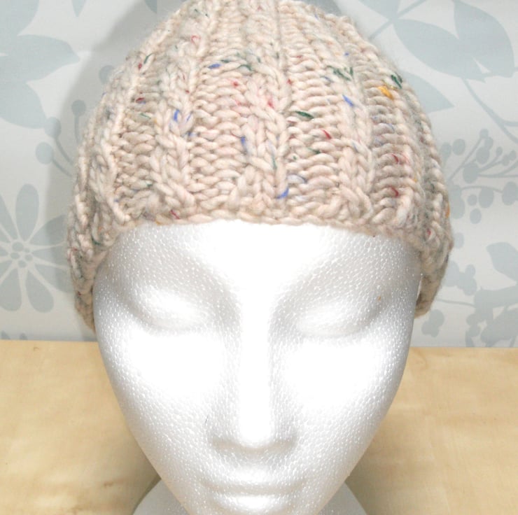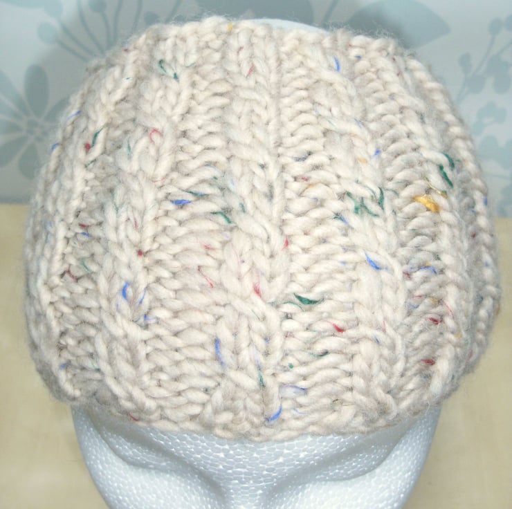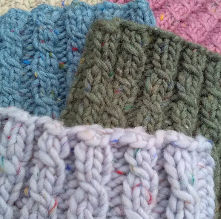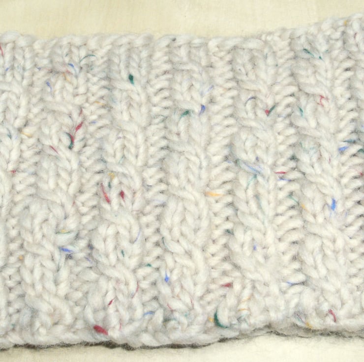 Very soft and warm these bands have plenty of stretch. This 80% merino blend has small coloured neps which give a lovely finish to a plain colour. This new cabled design is simple but effective and will hold its shape well.