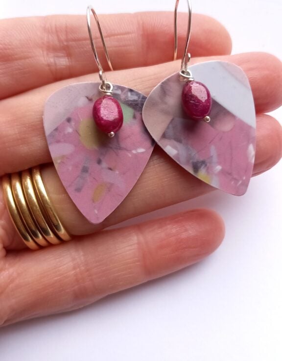 Pretty pink terrazzo pattern guitar pick earrings with natural rubies and recycled sterling silver hooks.