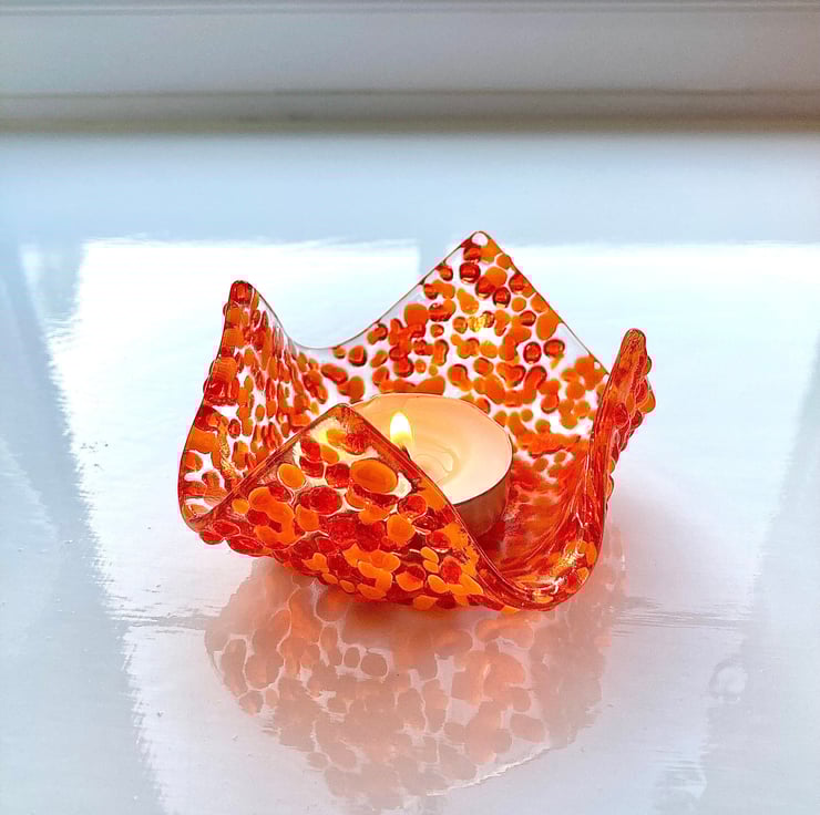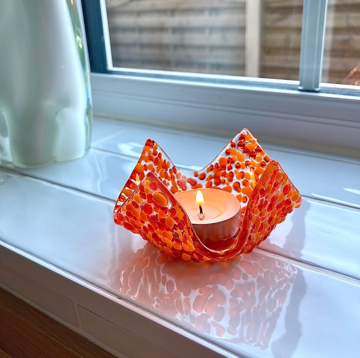 Fused glass orange candle holder I have made by layering different shades of orange crushed stained glass on to a clear piece of glass. The glass is then fused together in the kiln to 800 degrees for 12 hours and heated a second time to shape the candle holder.