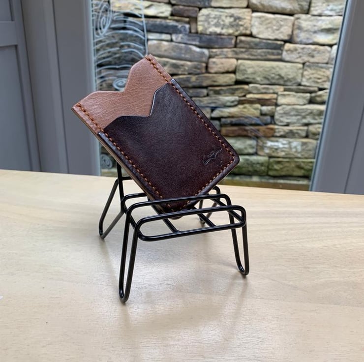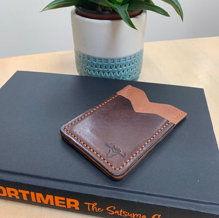 The Lenny two-tone card wallet is handcrafted using a veg tan rich brown Pueblo leather from the world renowned Italian Badalassi tannery and Crazy Horse leather in a mid brown. The wallet will develop a wonderful patina with age and use.