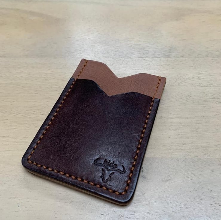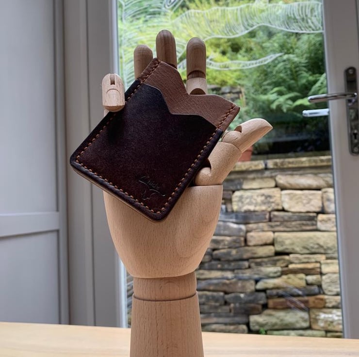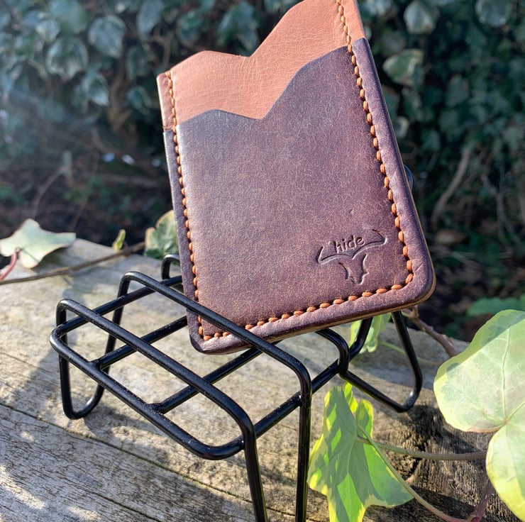 The card wallet is hand sewn using traditional saddle stitching with Italian waxed slam thread in Havana for superior strength. The edges are burnished to seal the leather so it retains its natural oils and won’t dry out. Because both leathers are full grain leather it means the hide has not been buffed or sanded to remove any marks so colourings and texture will vary from piece to piece as all are unique and with care should last a lifetime.