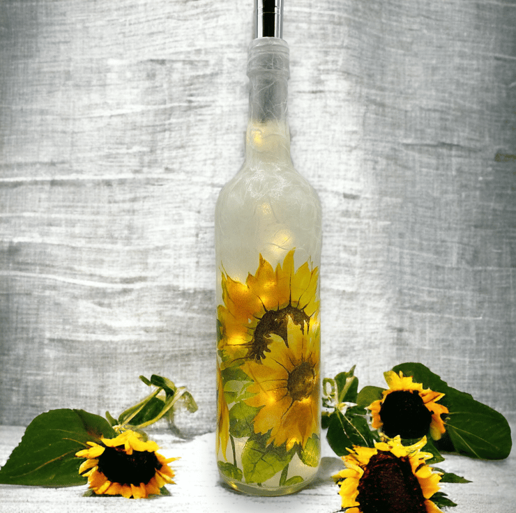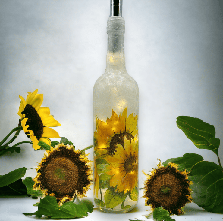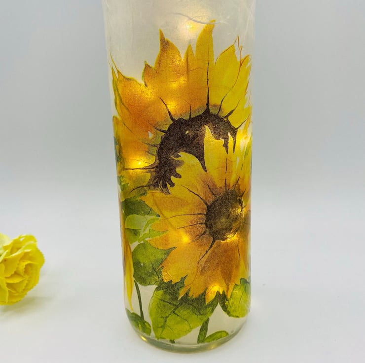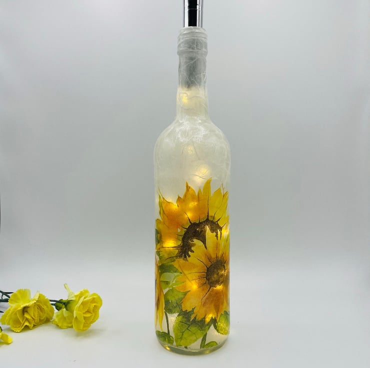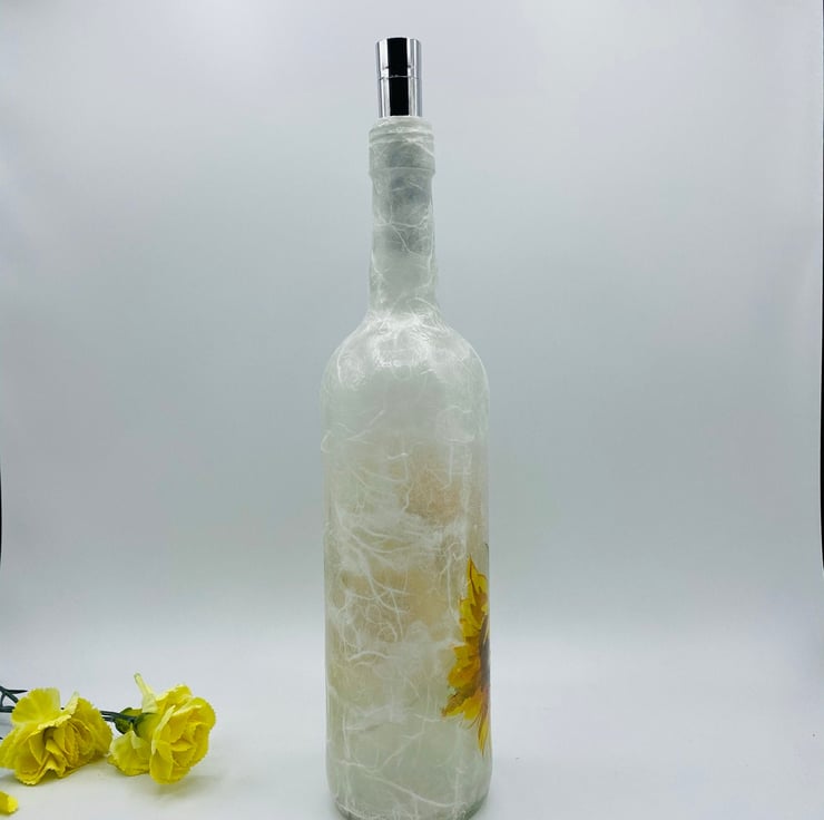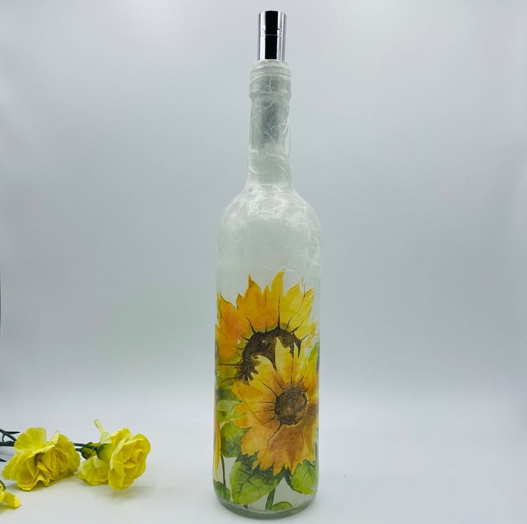 Beautifully decorated wine bottle, decoupaged with paper napkins featuring beautiful sunflowers. The bottle is lit by a set of LED lights on a wire running from a metal cork which fits in the top of the bottle. The cork lights are battery operated using AA battery and can be easily replaced by unscrewing the top of the cork.