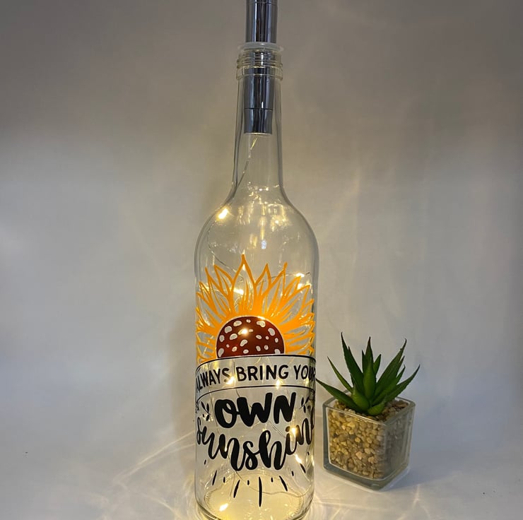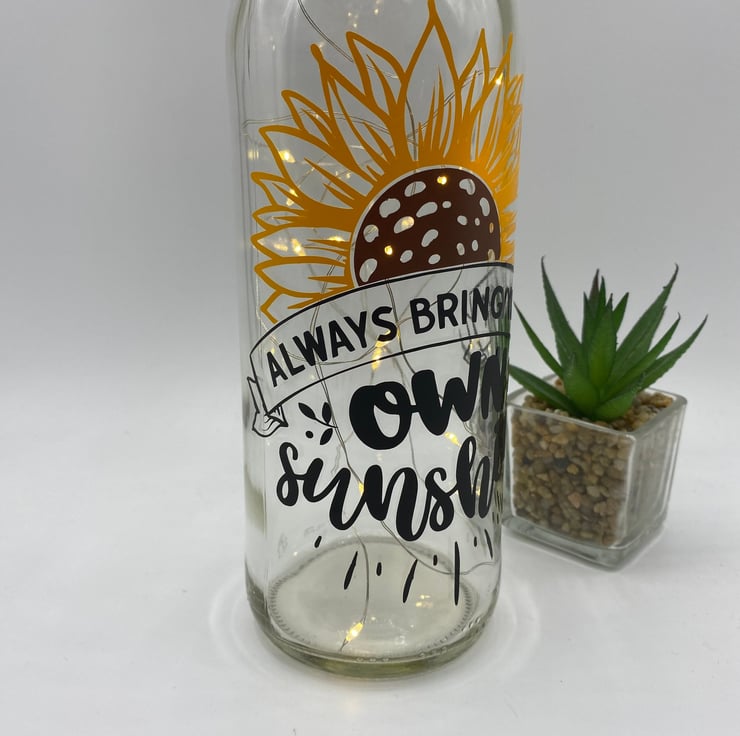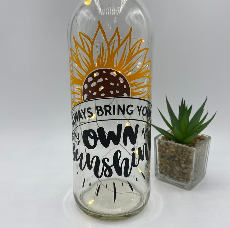 This is a clear wine bottle decorated with a vinyl Sunflower and the words Always bring your own Sunshine.