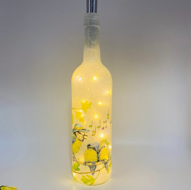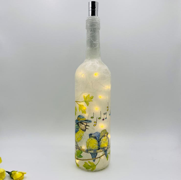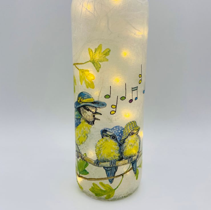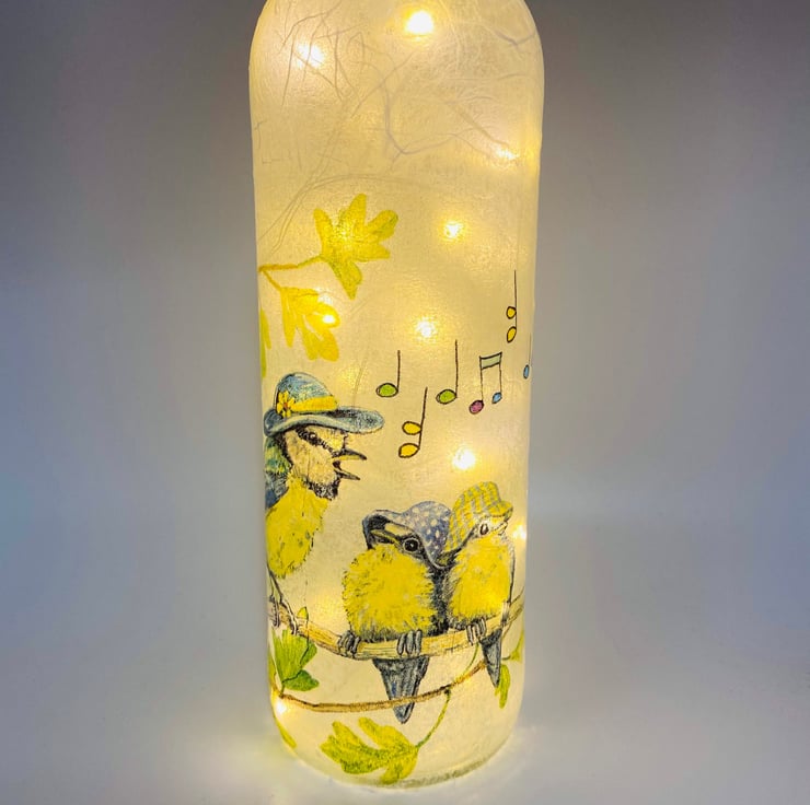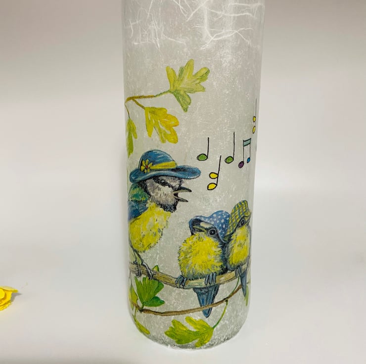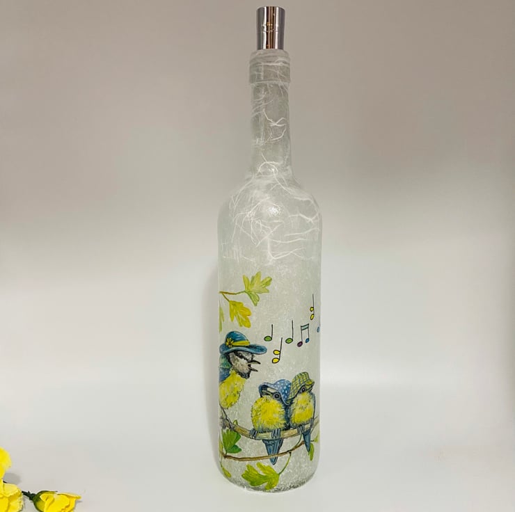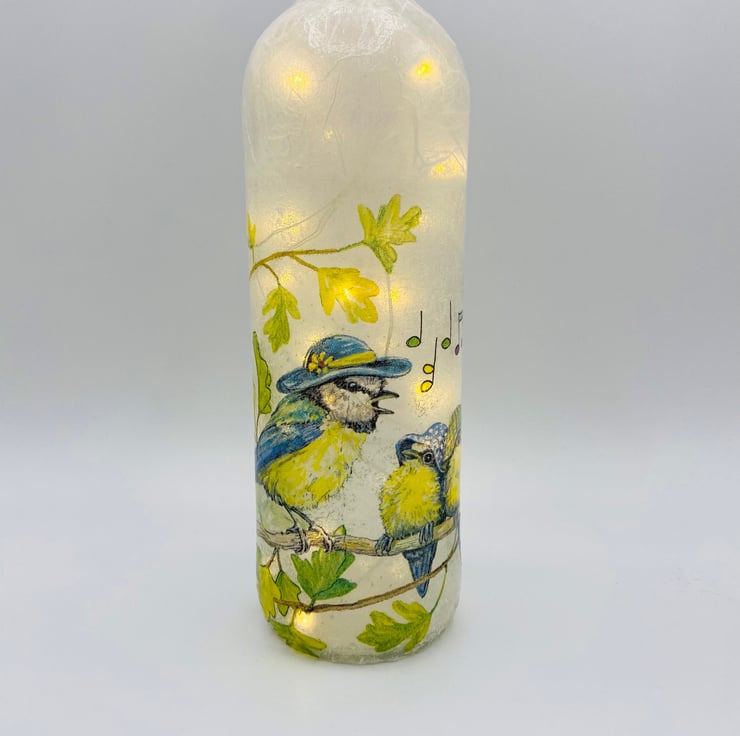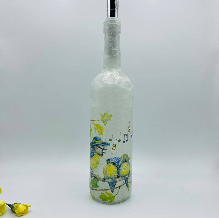 This is a clear wine bottle decoupaged with white rice paper followed by a paper napkin design featuring beautiful little Blue Tit family having a sing.