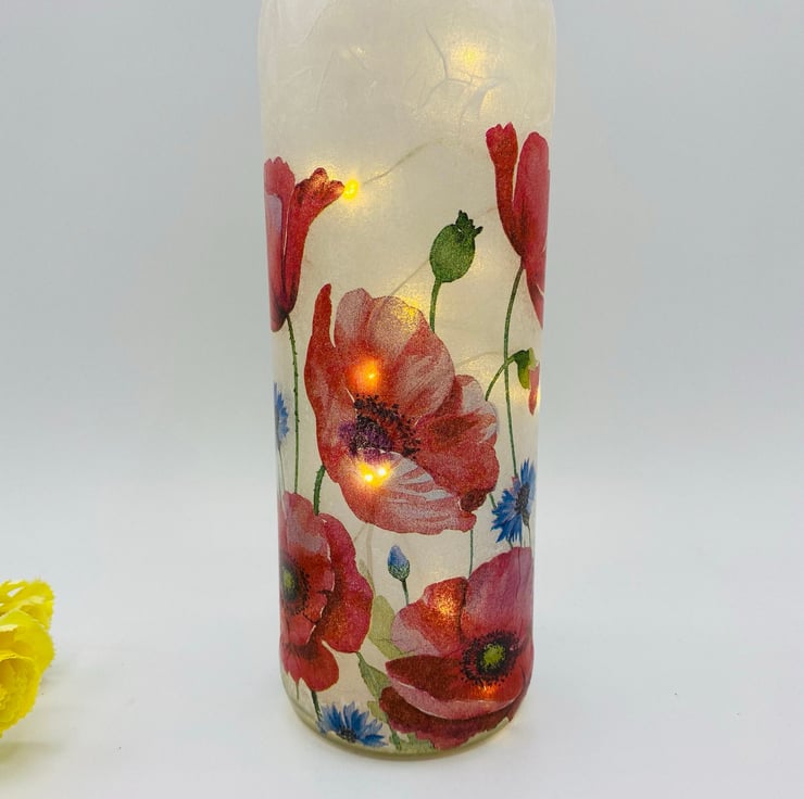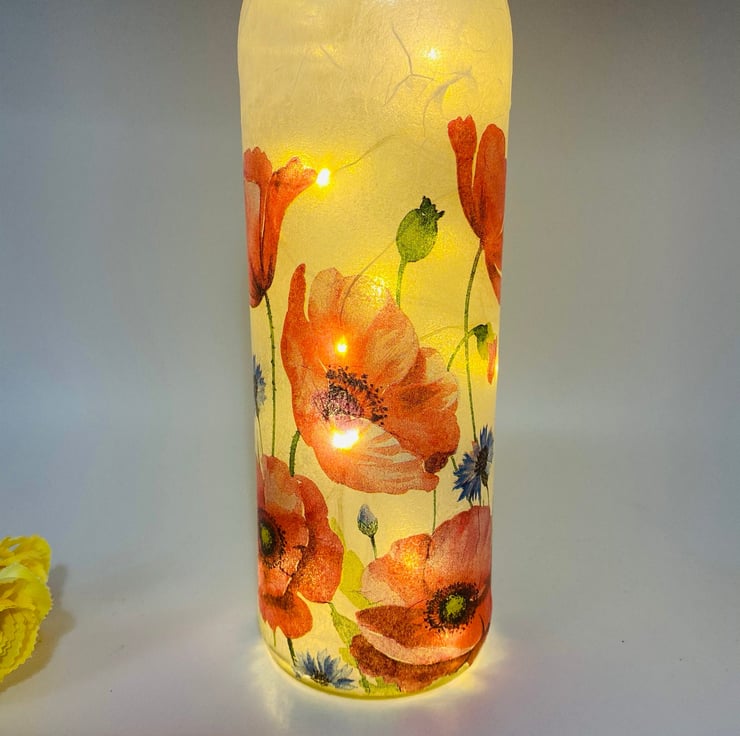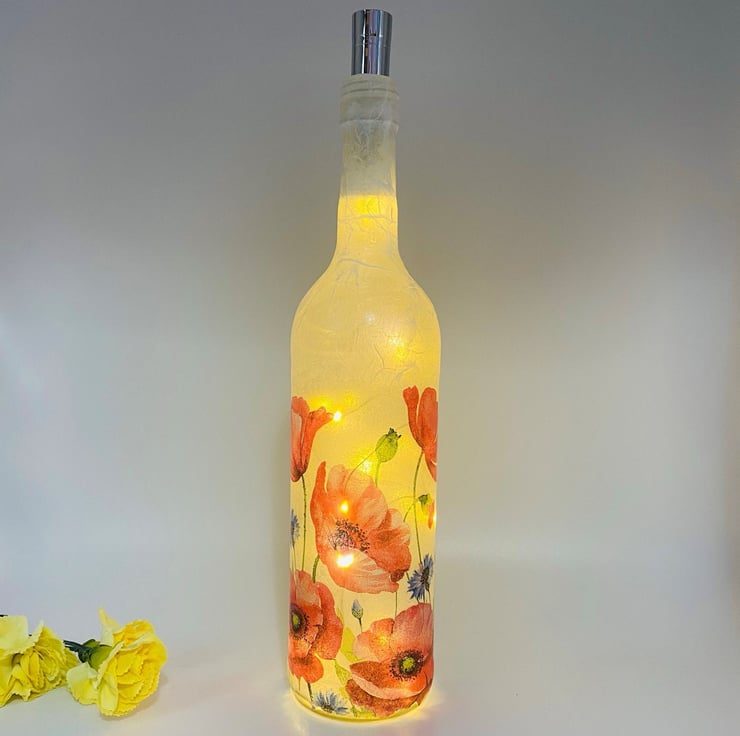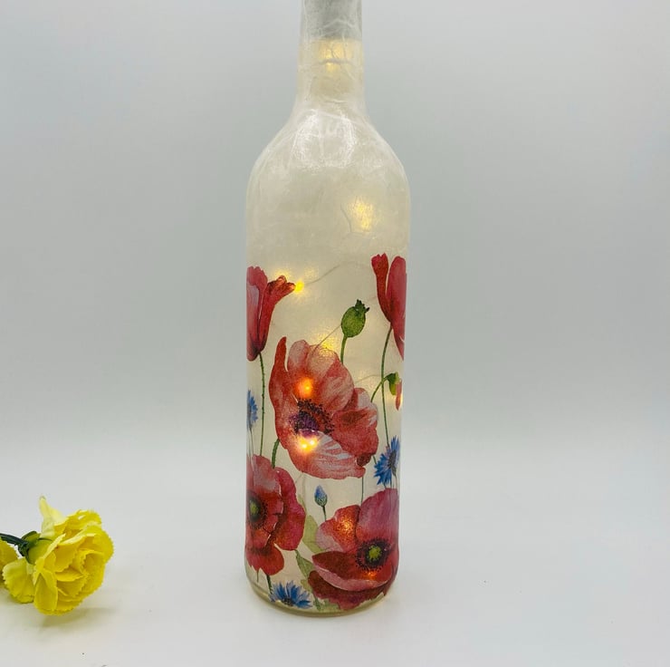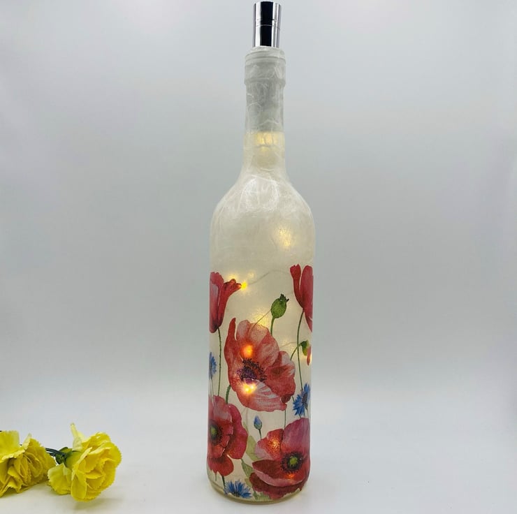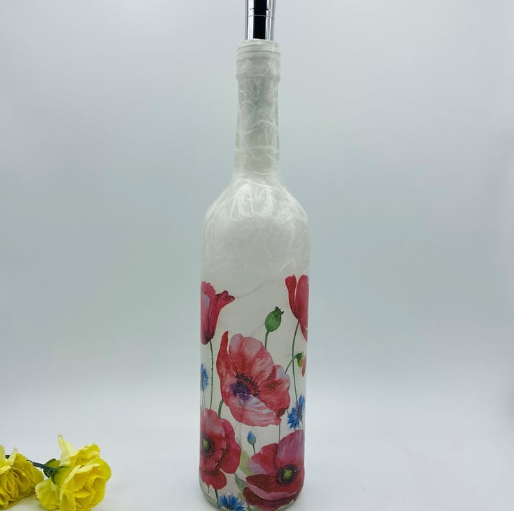 This is a clear wine bottle decoupaged with white rice paper and a paper napkin design featuring beautiful wild red poppies