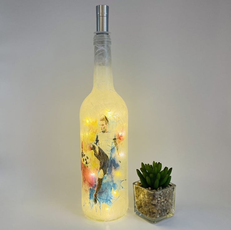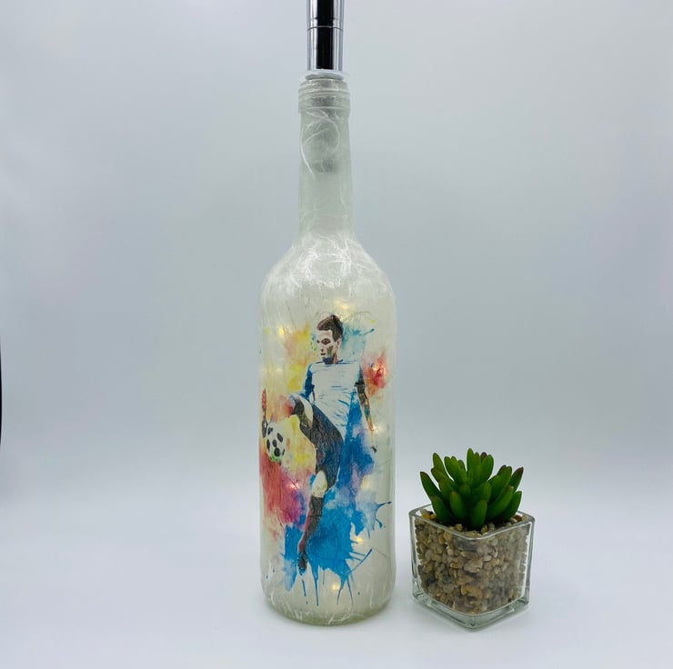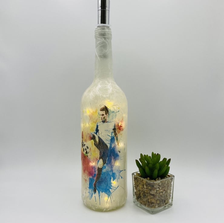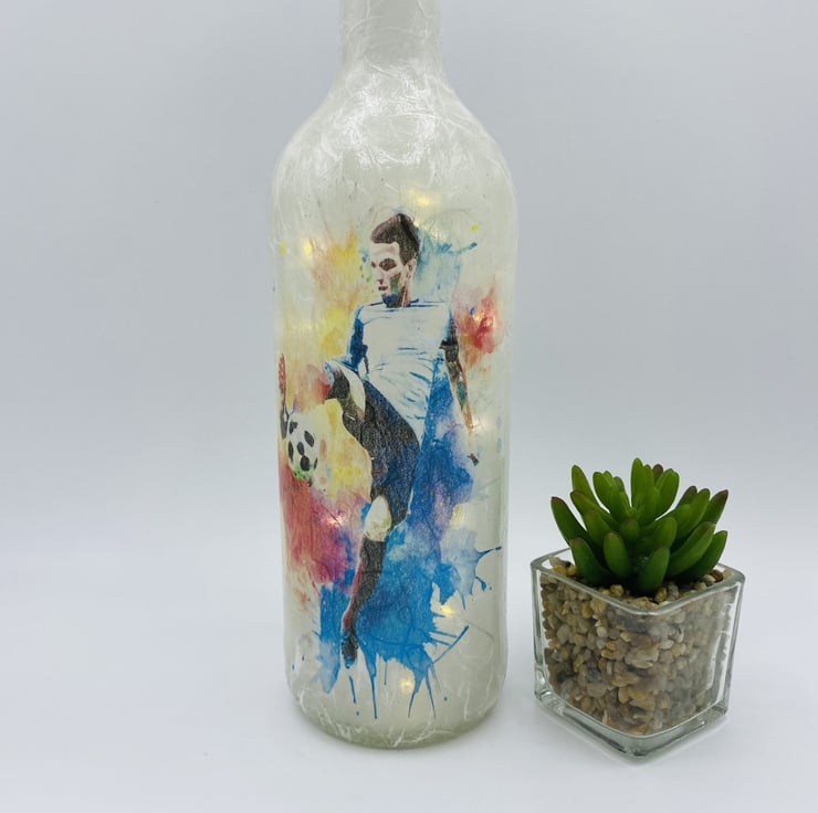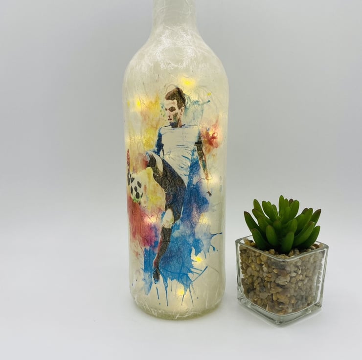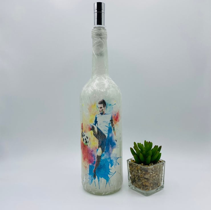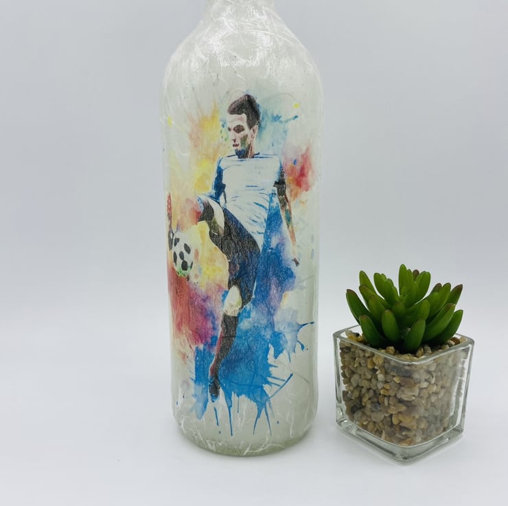 Decorated wine bottle, decoupaged with mulberry paper featuring a footballer kicking a ball. Ideal unique gift for dad, granddad, uncle or any football lover.