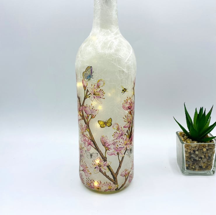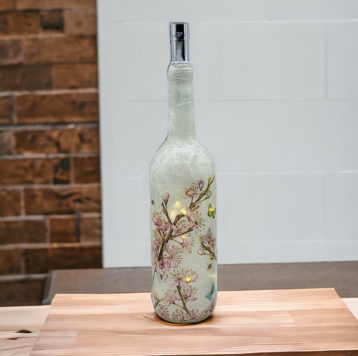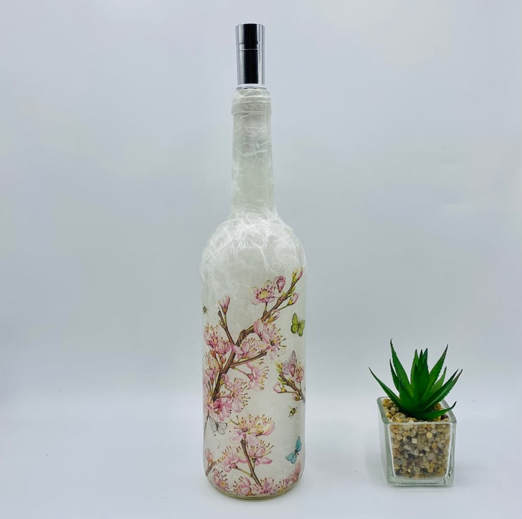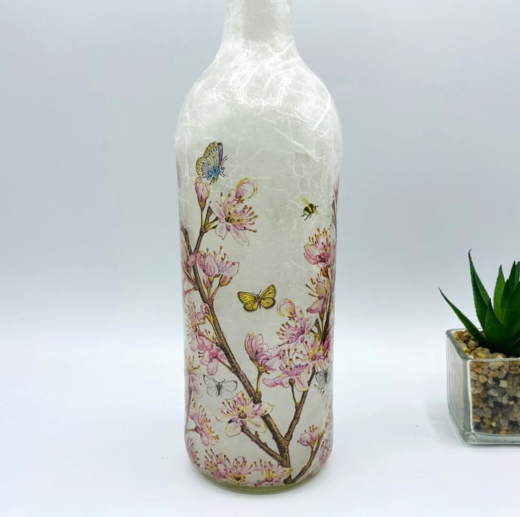 This is a clear wine bottle decoupaged with white rice paper and a paper napkin featuring beautiful blossom with butterflies and bees. Perfect as a gift for nature lovers or as a special treat for yourself, this piece is a true standout in any room.