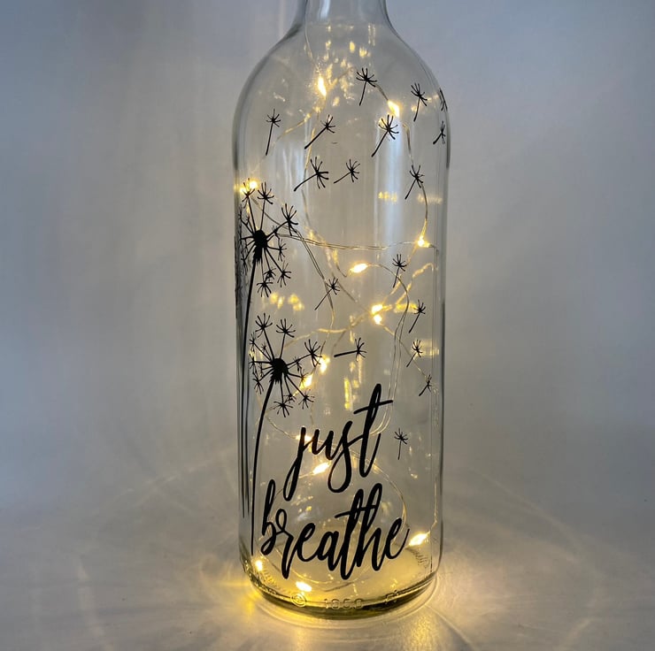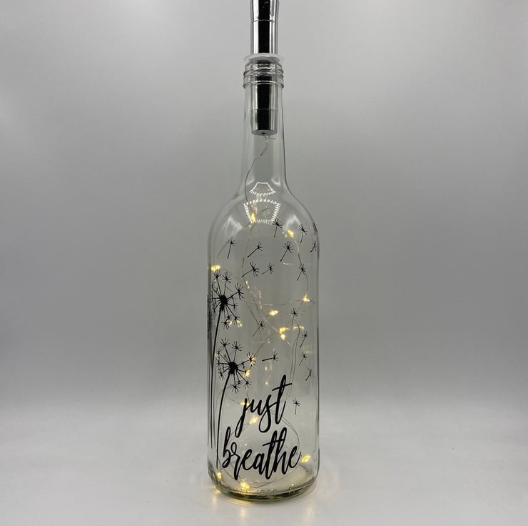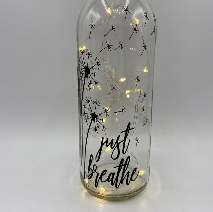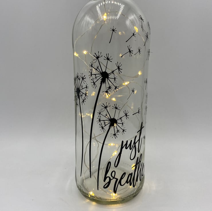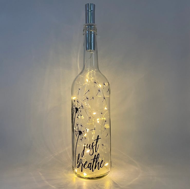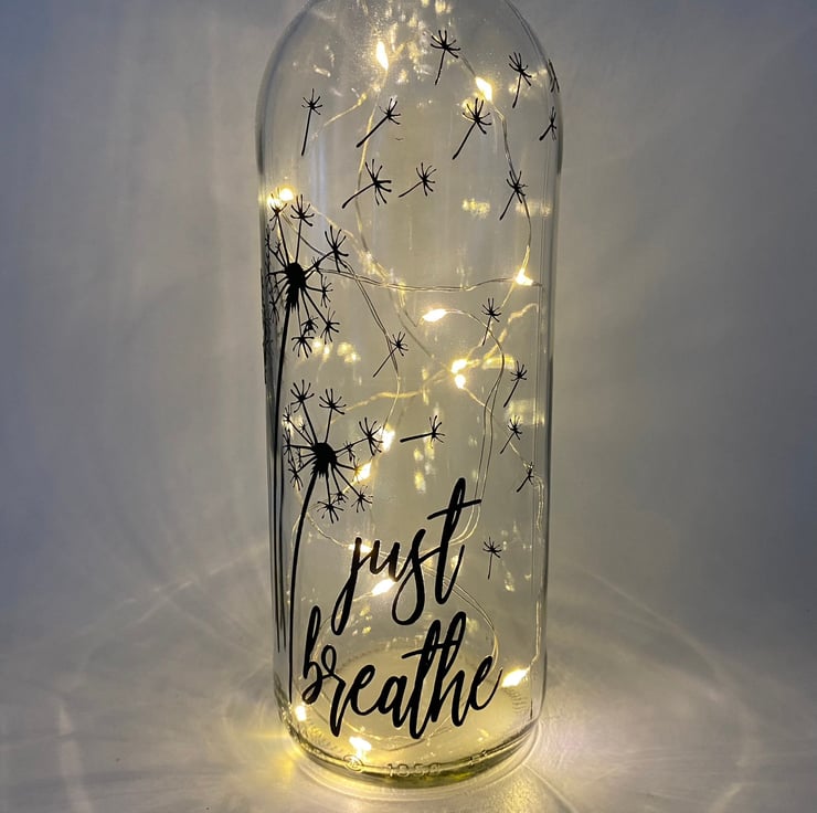 The "Dandelion Bottle Light with Just Breathe Vinyl Words" is a charming decorative piece featuring a delicate dandelion design on a clear glass bottle. Illuminated by soft LED lights, the bottle casts a warm glow, perfect for adding a calming ambiance to any room. The words "Just Breathe" are elegantly displayed on the outside in vinyl, serving as a gentle reminder to relax and unwind. This unique item makes a thoughtful gift or a soothing addition to your home decor