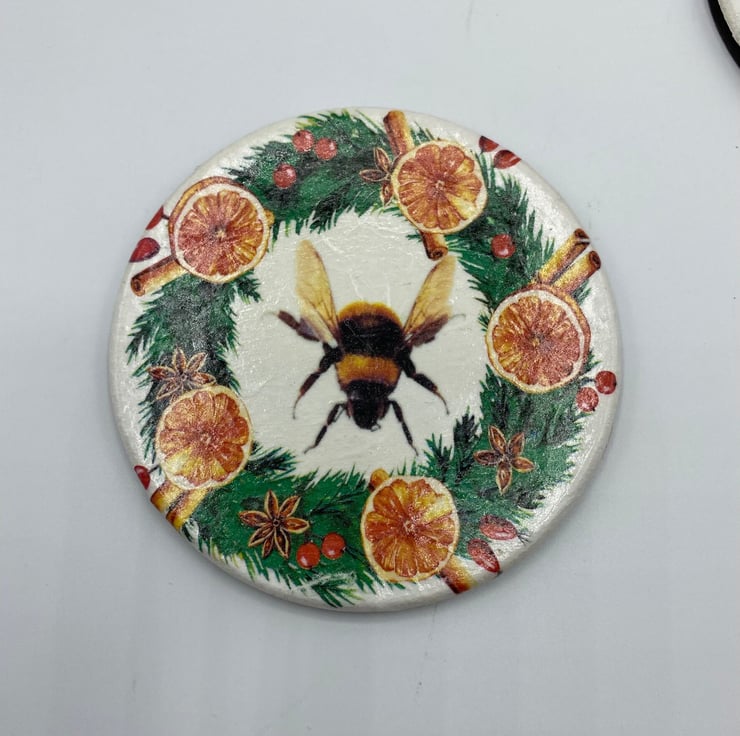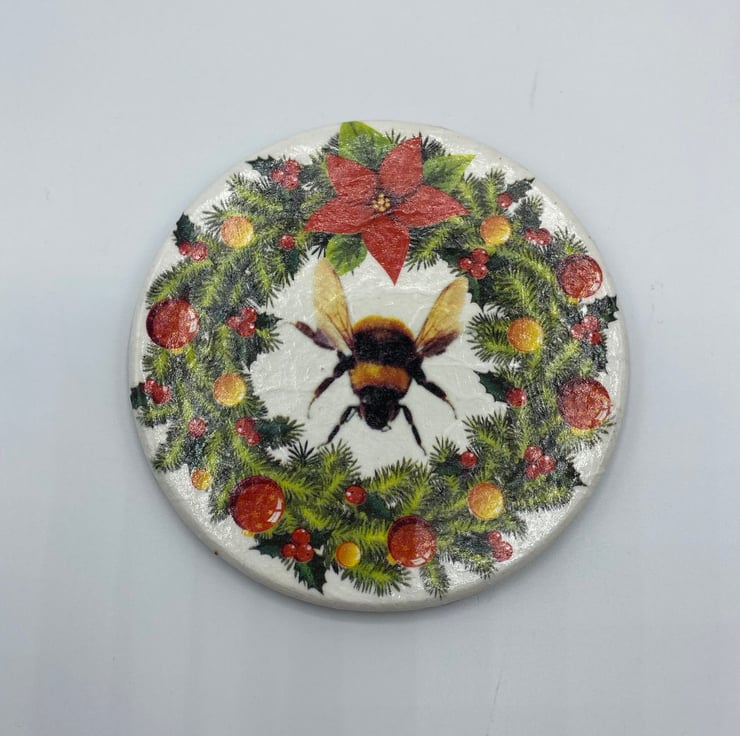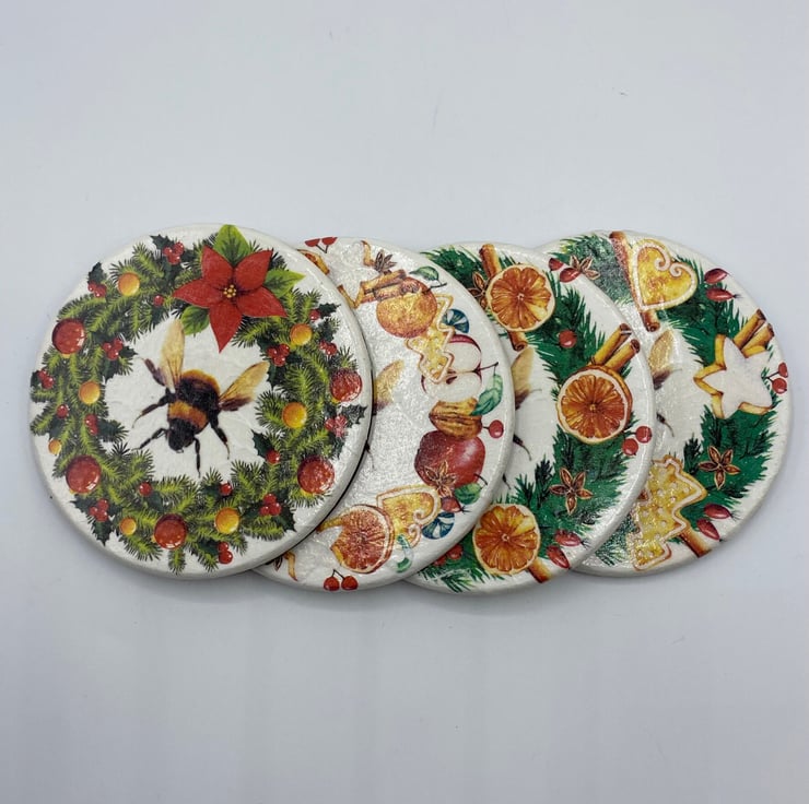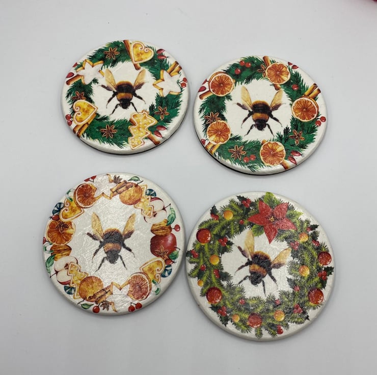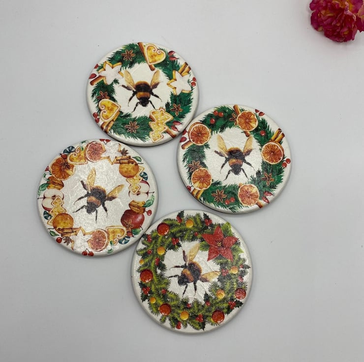 Introducing a charming addition to your home decor - a decoupaged set of 4 wooden coasters with a delightful bee autumnal/Christmas design. These coasters are not only functional, but also add a touch of nature-inspired elegance to your space. Perfect for hosting gatherings or simply enjoying a relaxing evening at home, these coasters protect your table surfaces while bringing a welcoming autumm ambiance. Enhance your home with this lovely bee autumn decor and make a stylish statement in any room.