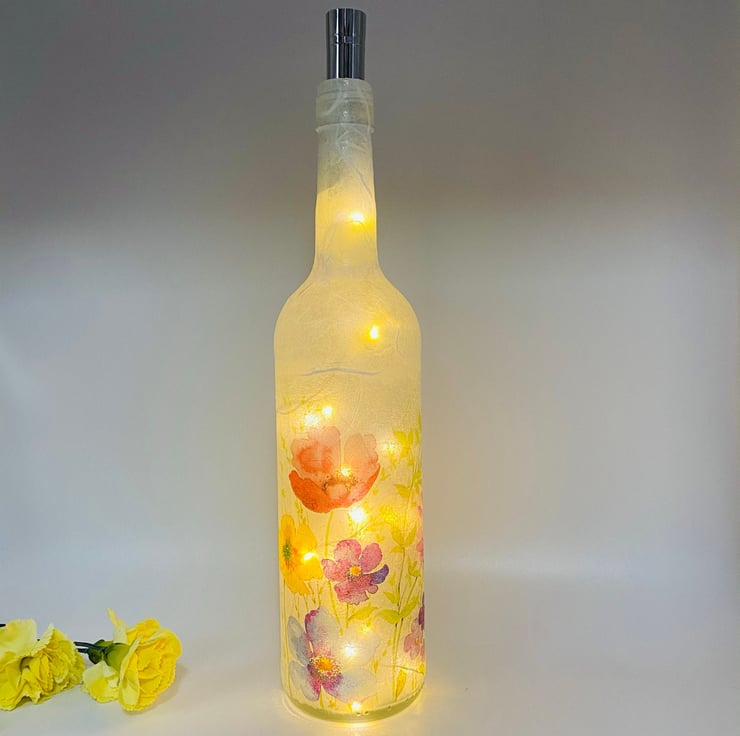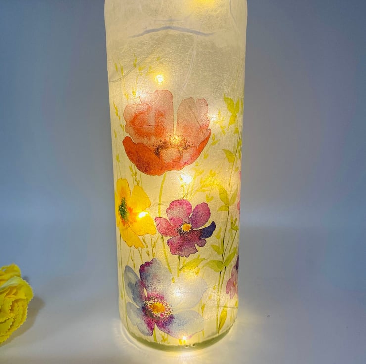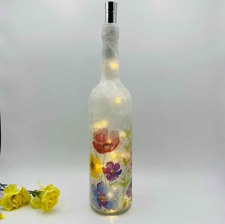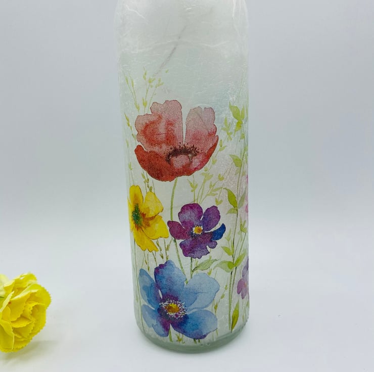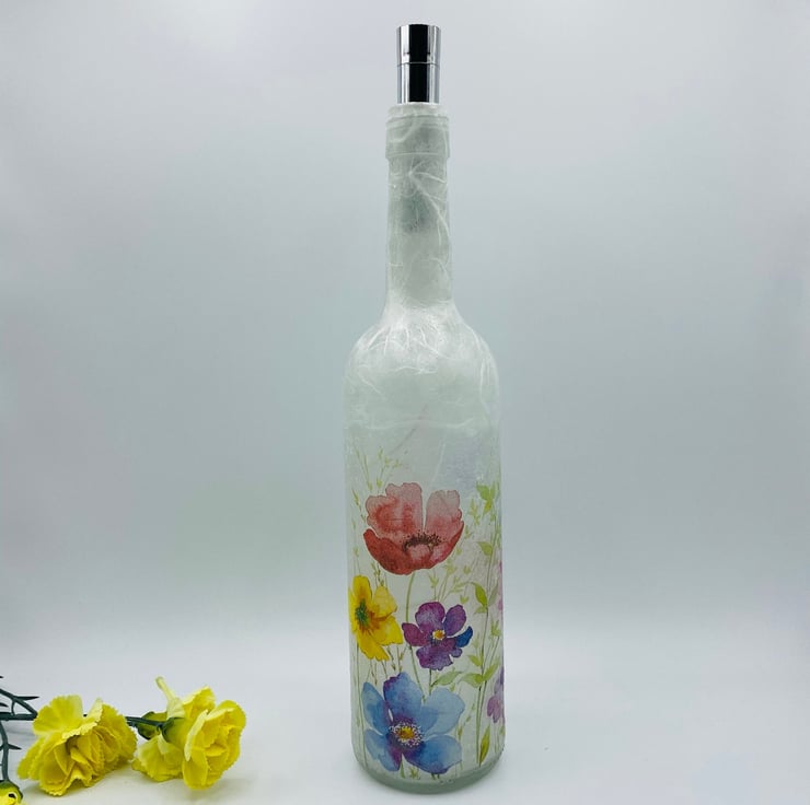 This is a clear wine bottle decoupaged with white rice paper and a paper napkin design featuring beautiful summer flowers painted in watercolours.
