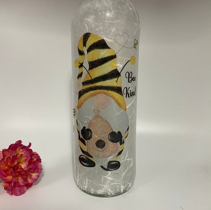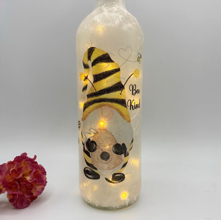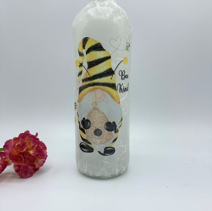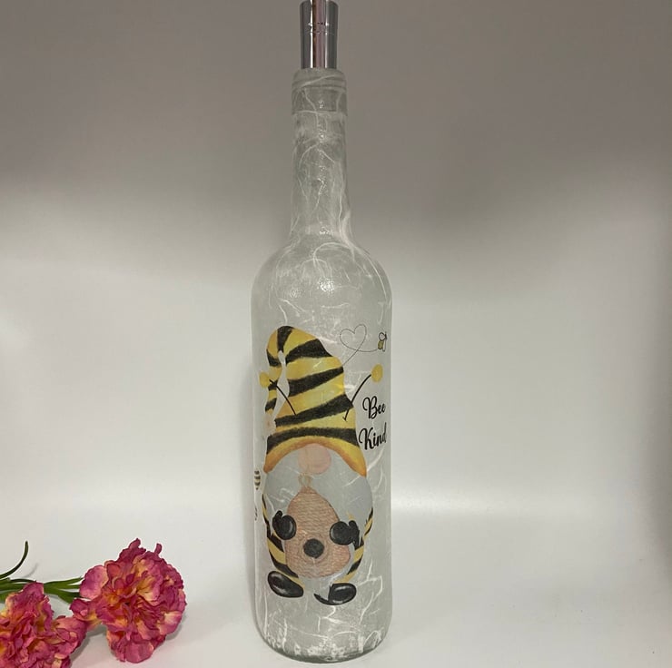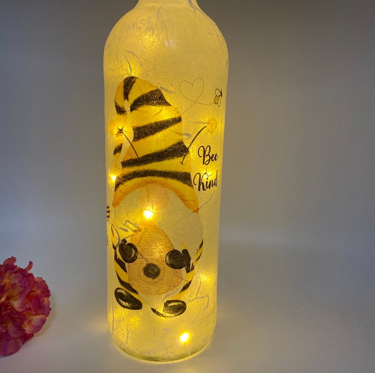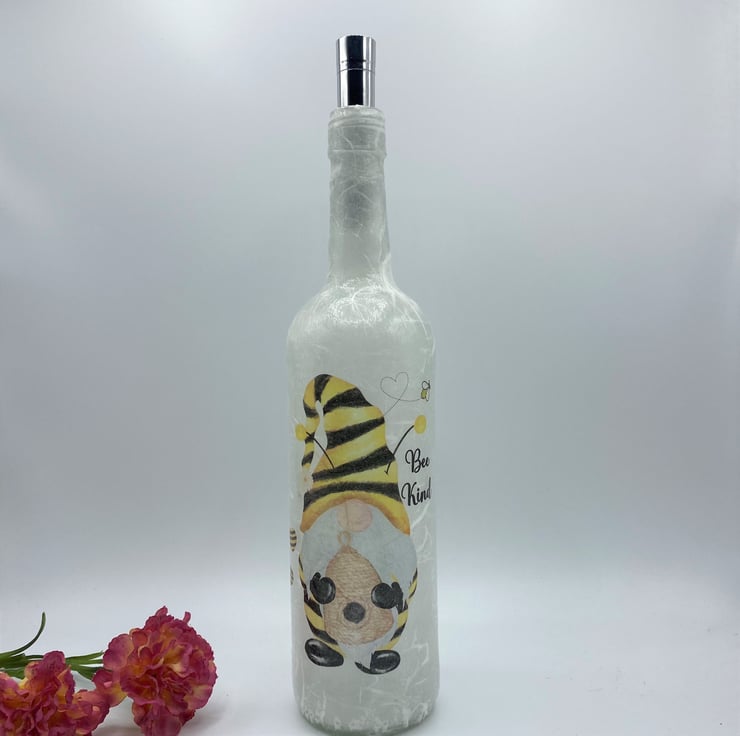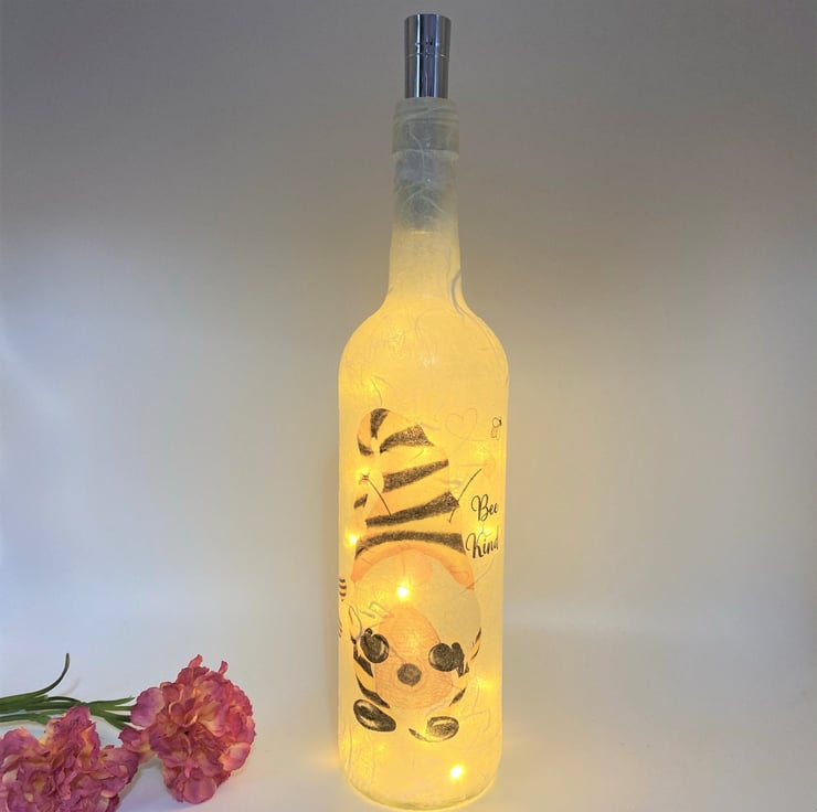 Decorated wine bottle decoupaged with rice paper featuring bees and a Gonk/Gnome with the words "Bee Kind". The bottle is lit by a set of LED lights on a wire running from a metal cork which fits in the top of the bottle. The cork lights are battery operated a single AA battery which can easily be replaced by unscrewing the top of the cork.