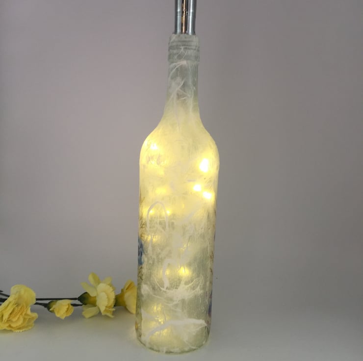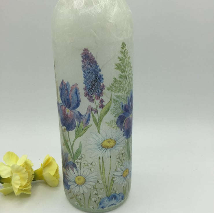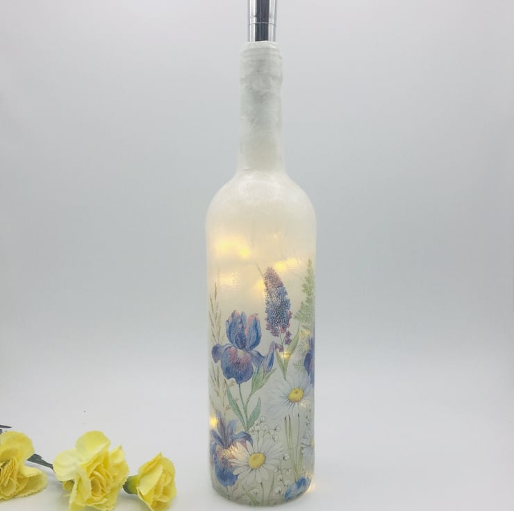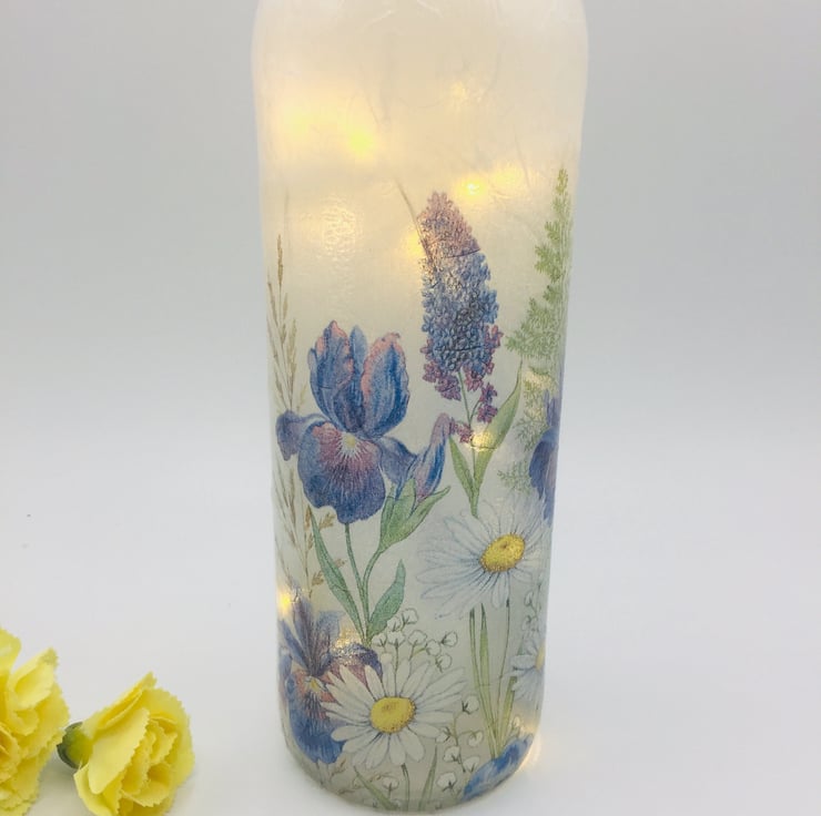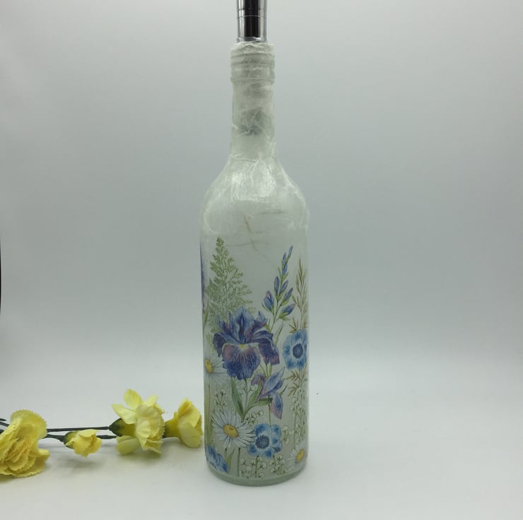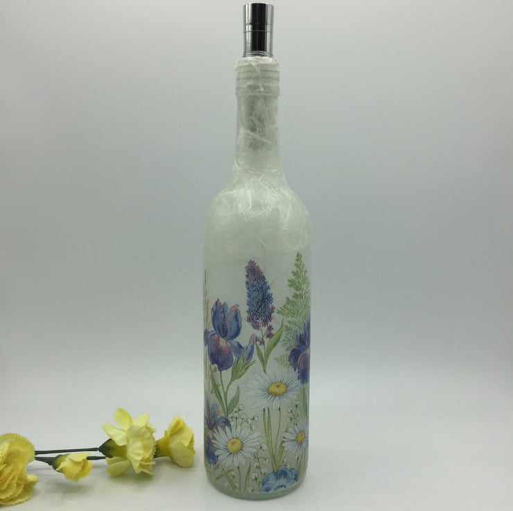 Decoupage Bottle light, Daisies, Iris, LED battery operated lights