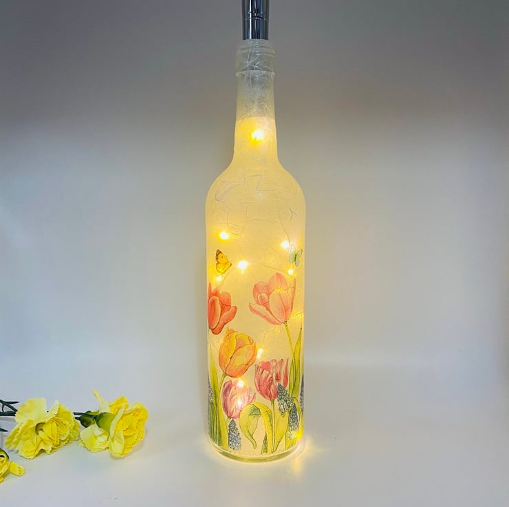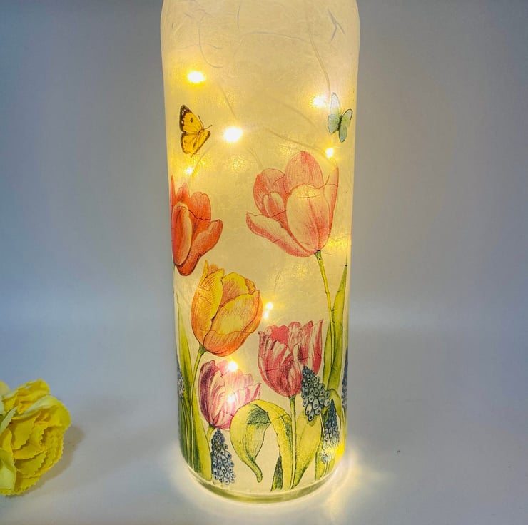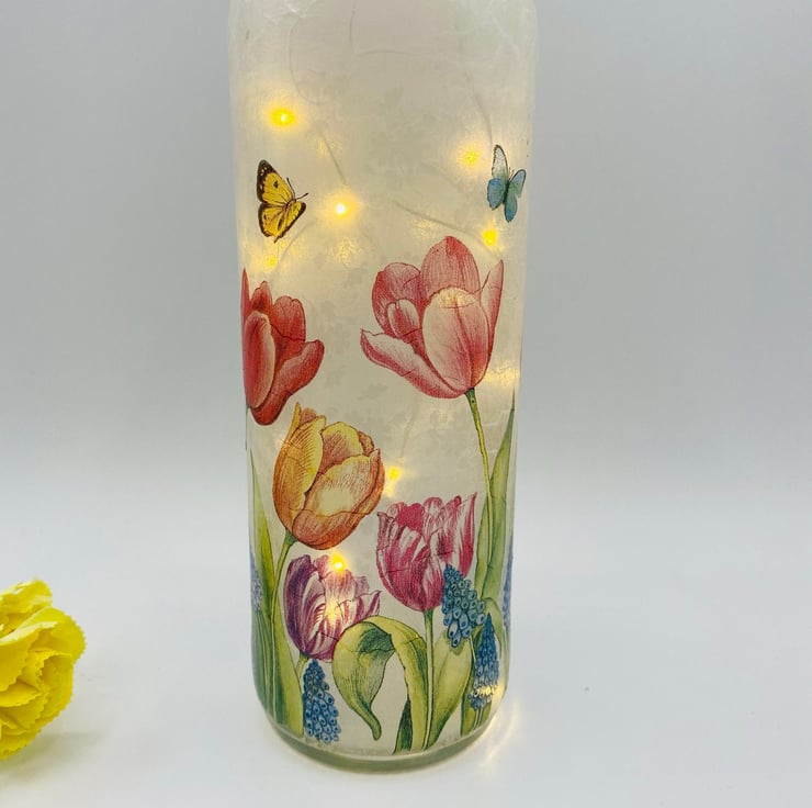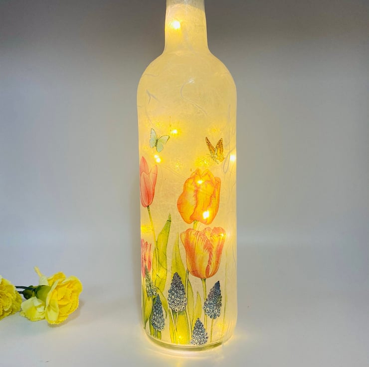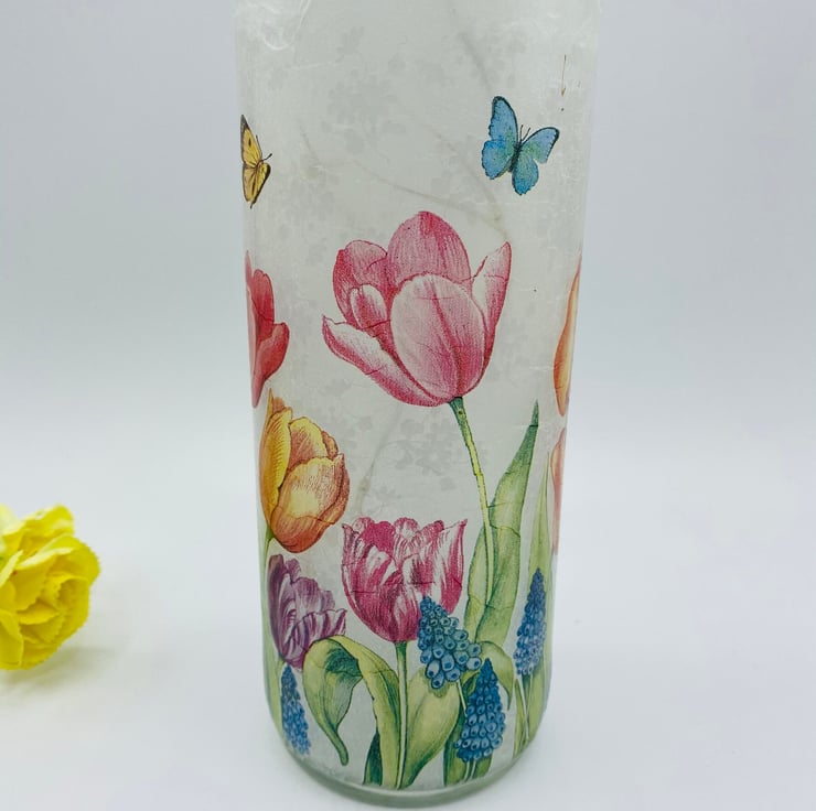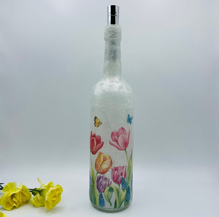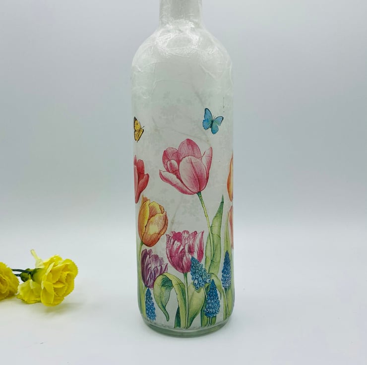 This is a clear wine bottle decoupaged with white rice paper and a paper napkin design featuring beautiful tulips.