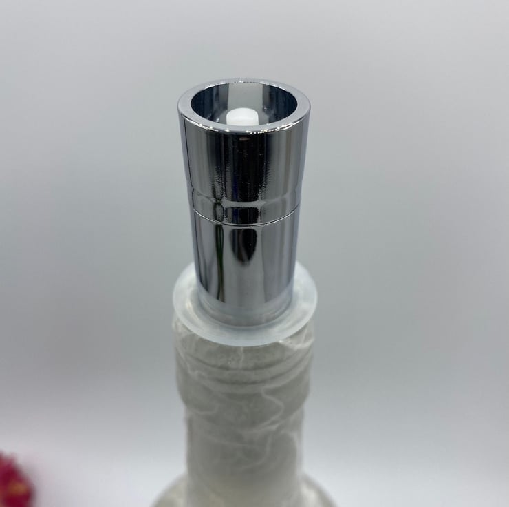 The bottle is lit by a set of LED lights on a wire running from a metal cork which fits in the top of the bottle. The cork lights are battery operated using a single AA battery which can be easily replaced by unscrewing the top of the cork.