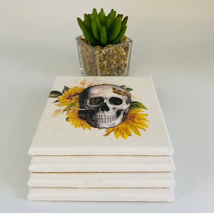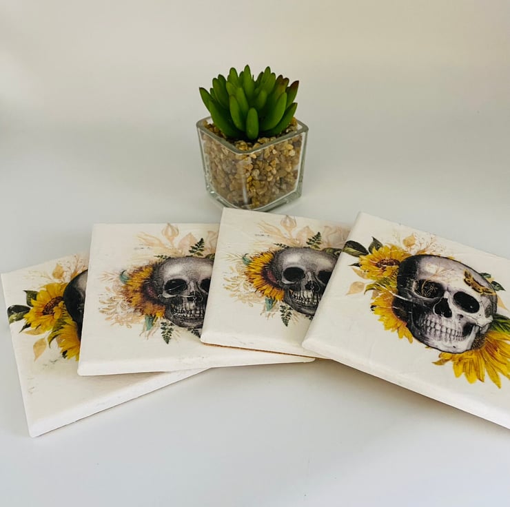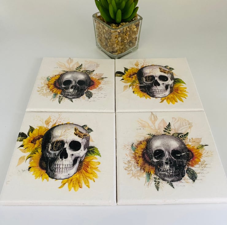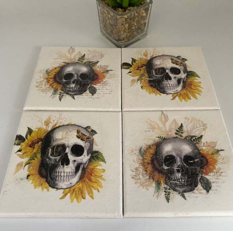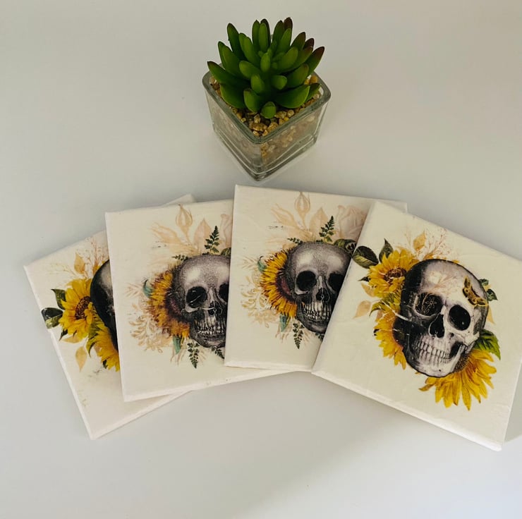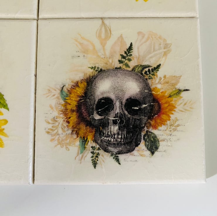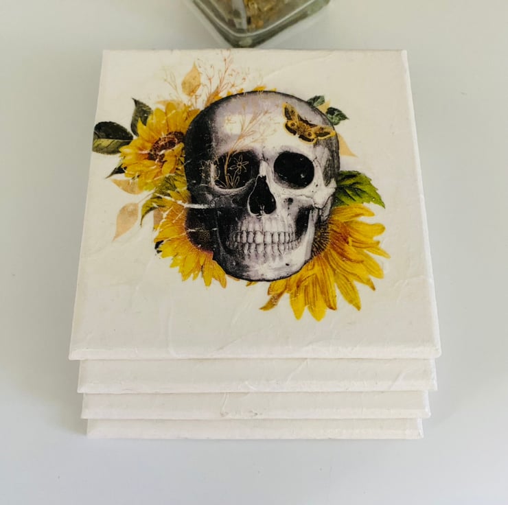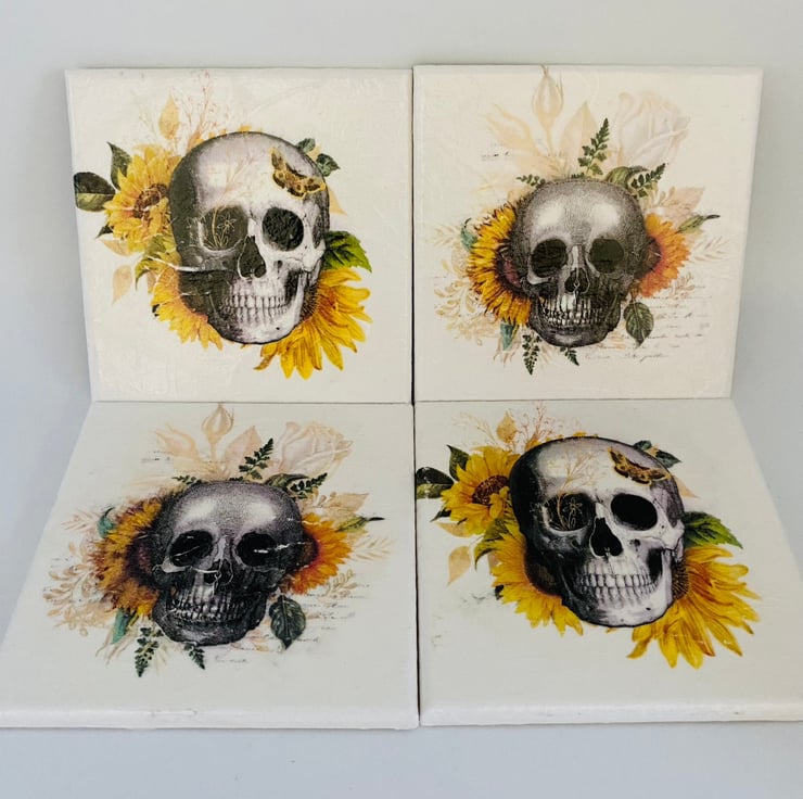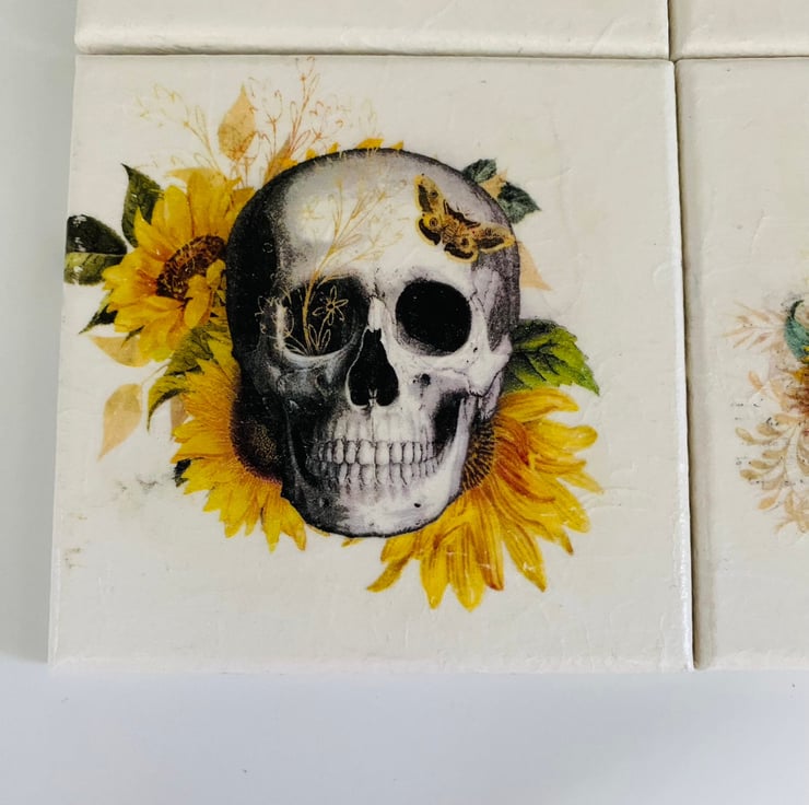 Set of four, square mdf coasters decoupaged with mulberry paper featuring floral skull designs. Hand decorated.
