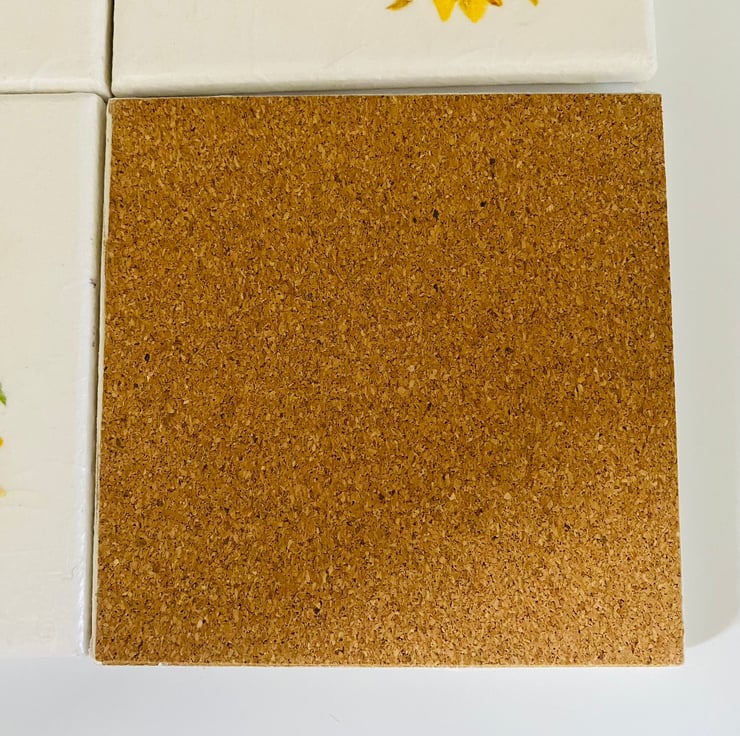 Each coaster measures 10x10cm. (4) and is finished with a heat resistant varnish. They have each been finished with a thin layer of cork on the reverse to protect your services.