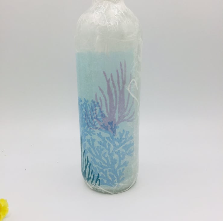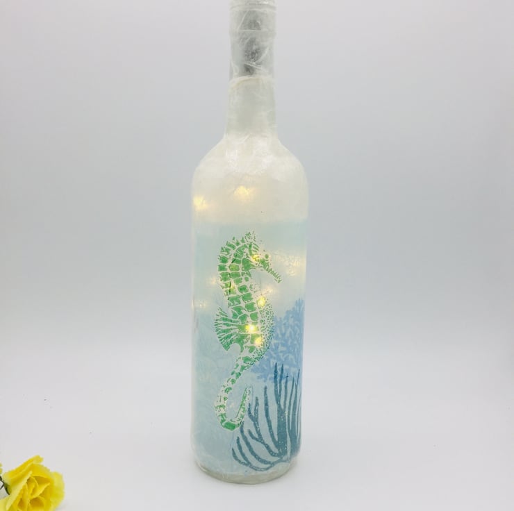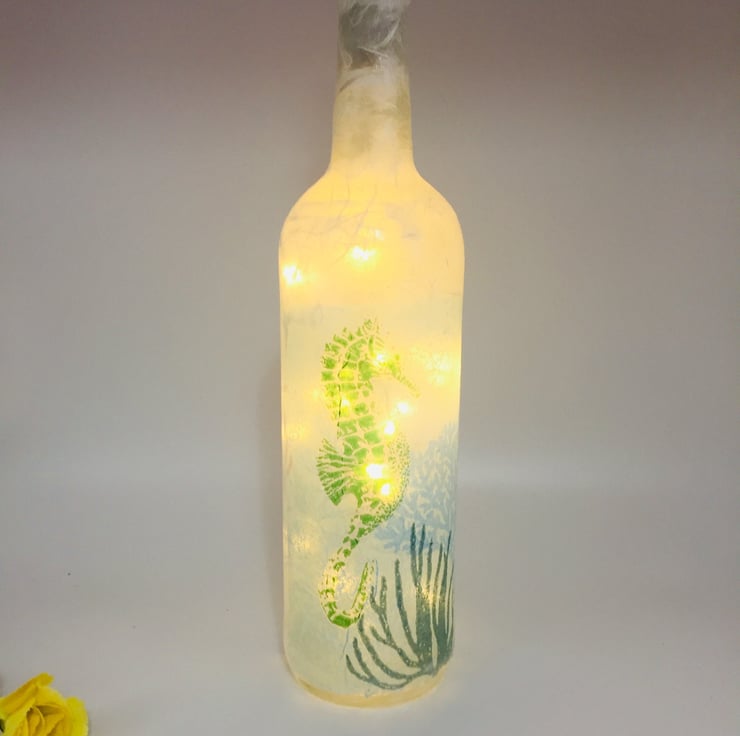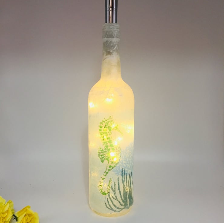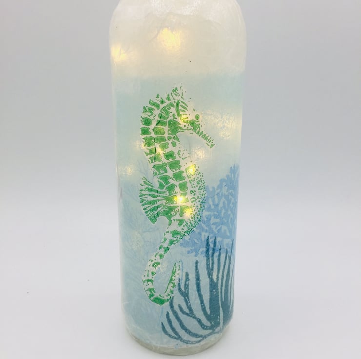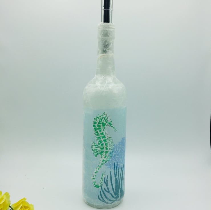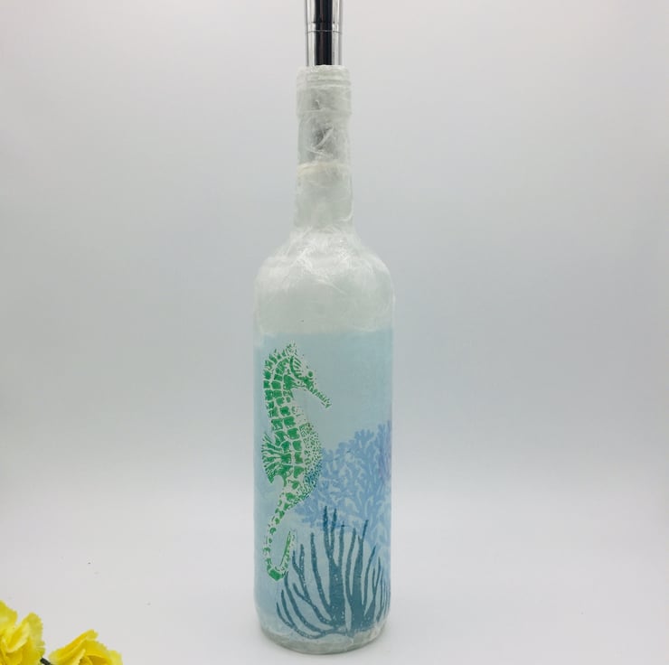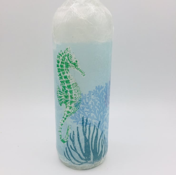 Up cycled wine bottle decoupaged with paper napkins featuring a seahorse.