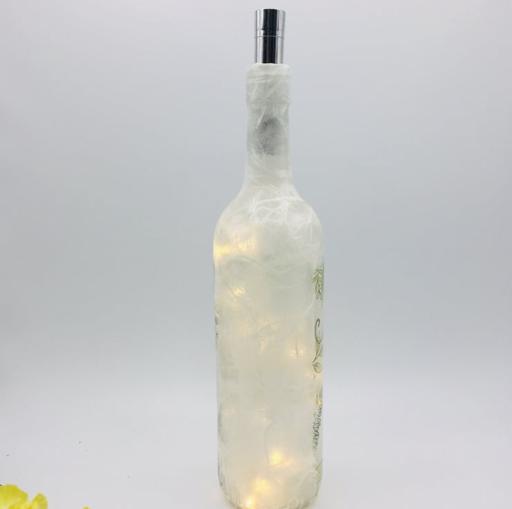 The bottle is lit by a set of LED lights on a wire running from a metal cork which fits in the top of the bottle. The cork lights are battery operated using a single AA battery which can be easily replaced by unscrewing the top of the cork.