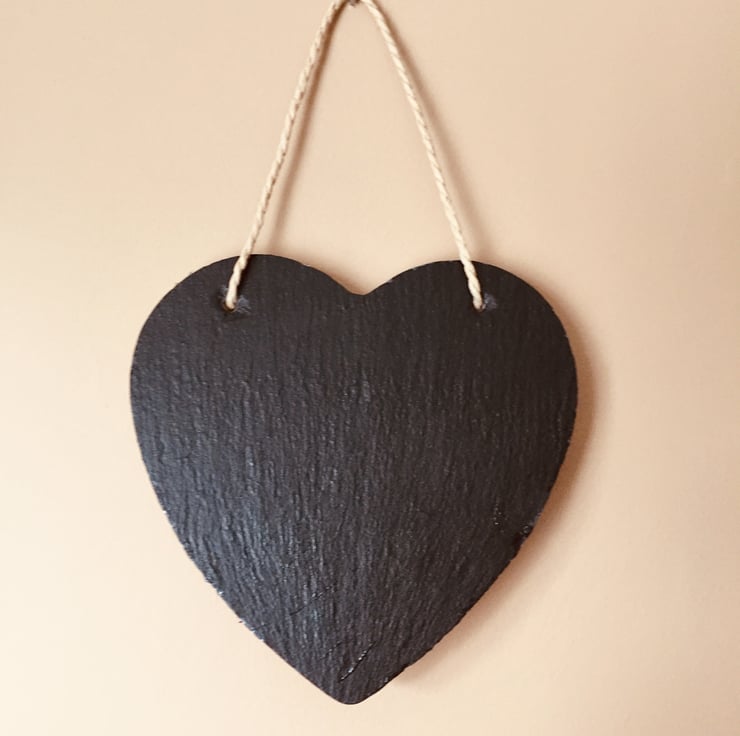 Decoupaged 15cm hanging slate heart. The heart has been painted black on the reverse. The slate comes on twine so its all ready to hang.