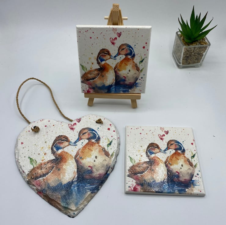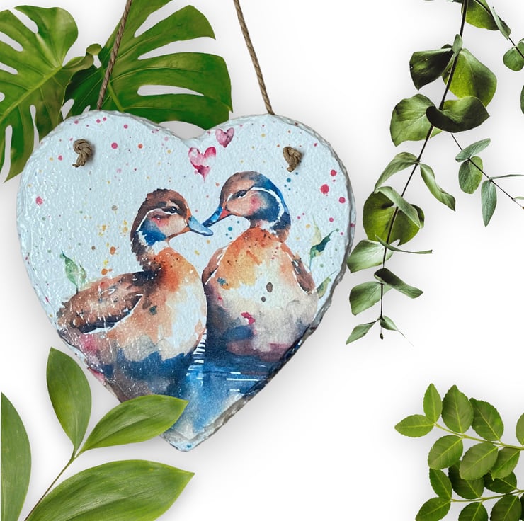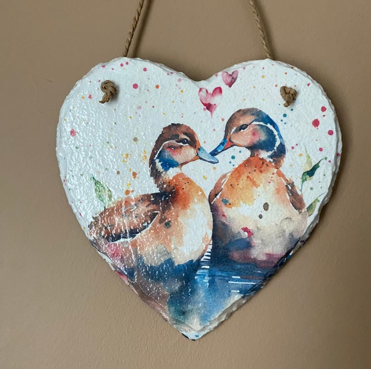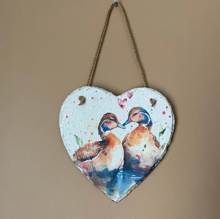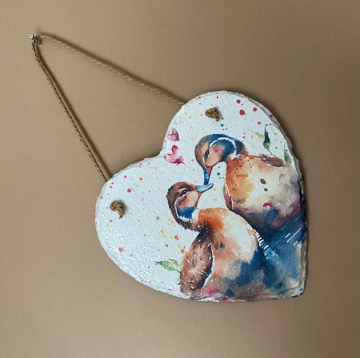 Add a touch of charm twith this delightful hanging slate heart adorned with sweet ducks. Handcrafted, this unique piece showcases the art of Decoupage, enhancing its rustic aesthetic. Whether you're a bird lover or simply looking to add a touch of whimsy, this adorable wall art is perfect for any space. Hang it in the foyer to welcome guests with a touch of nature or in the kitchen for a cozy farmhouse feel. Wherever it finds its place, this hanging slate heart is sure to bring a smile to your face and create a warm, inviting atmosphere.