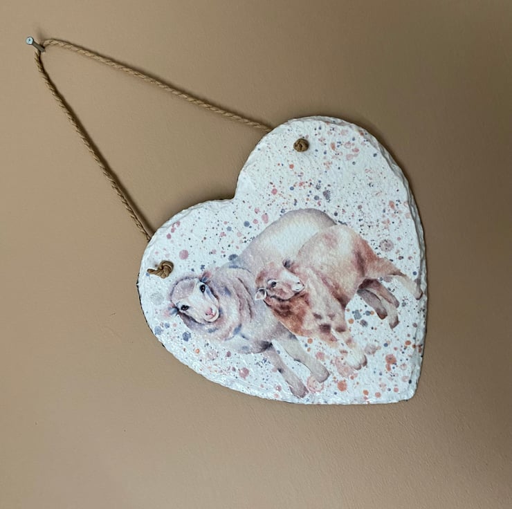 Add a touch of countryside decor to your home with this lovely Sheep and Lamb themed decoupaged Hanging Slate Heart. This unique piece features a beautiful heart-shaped slate adorned with a delightful image of a sheep and lamb. Perfect for adding a cozy, country feel to any space, this charming decor piece is ideal for hanging in your kitchen, living room, or even on your front door.. A must-have for any sheep or lamb enthusiast, this decoupaged heart makes a sweet and thoughtful gift for someone special or a lovely addition to your own collection.