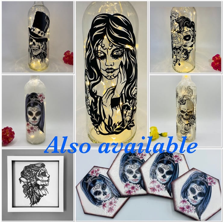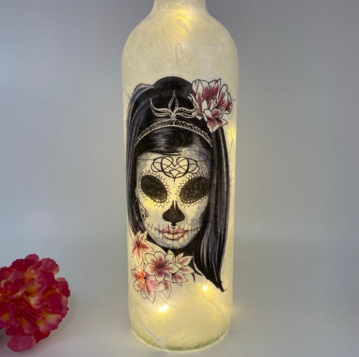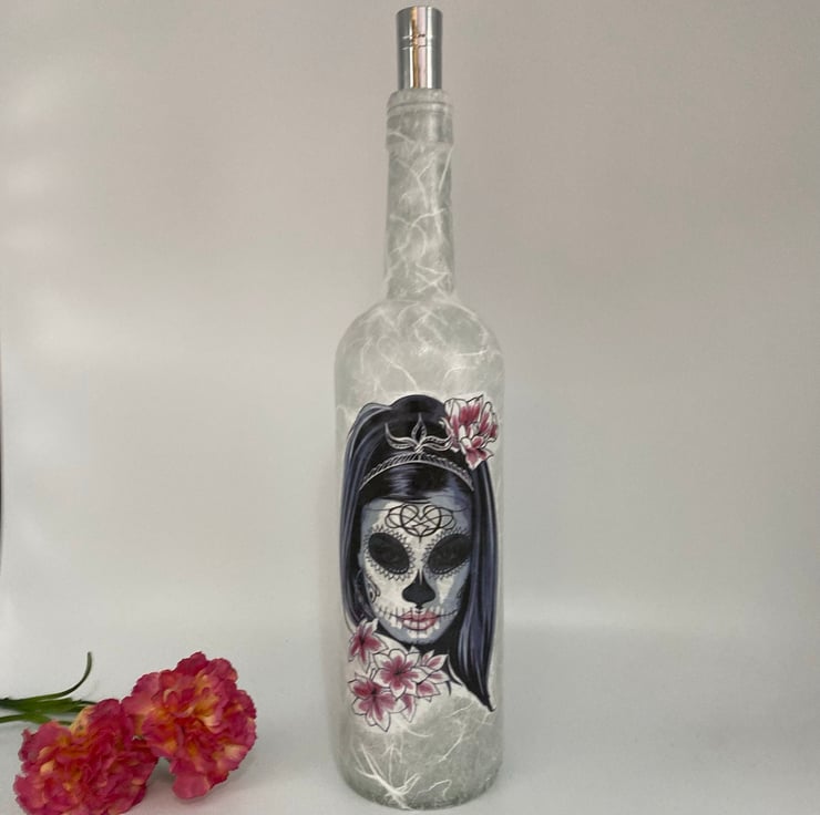 Decoupage bottle with lights, day of the dead, skull lady, gothic, halloween