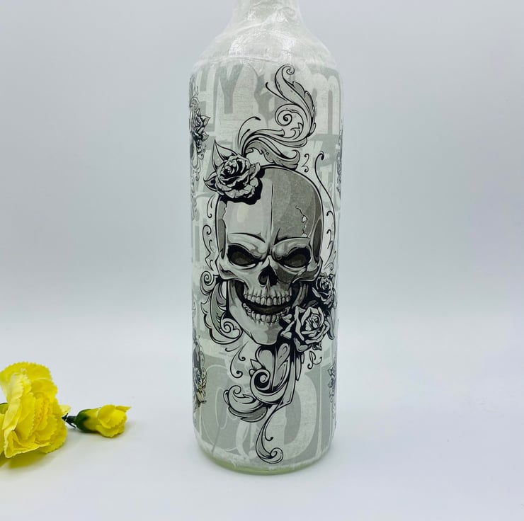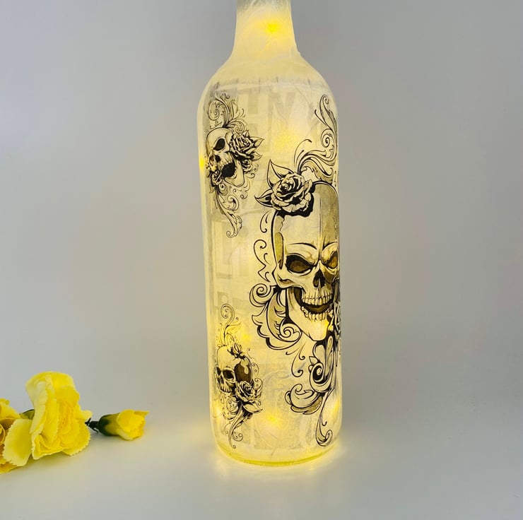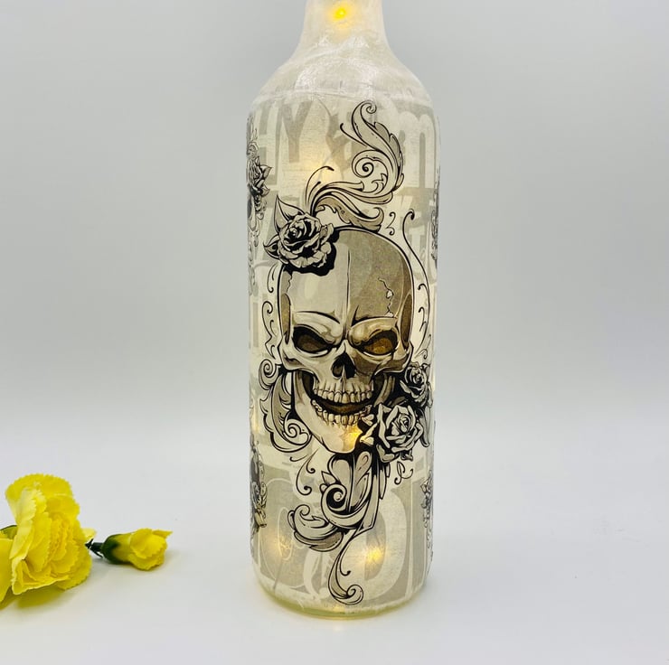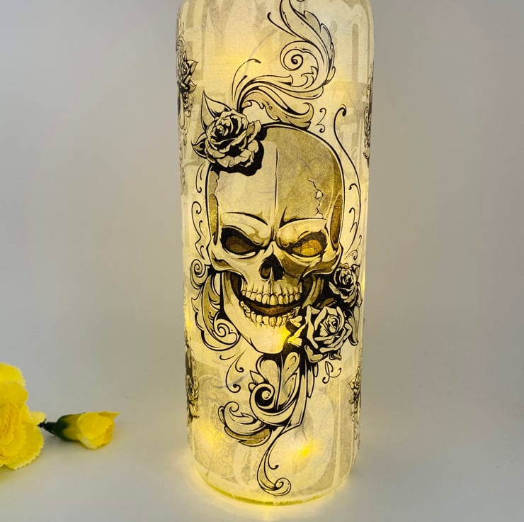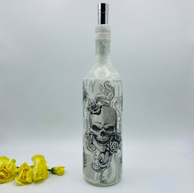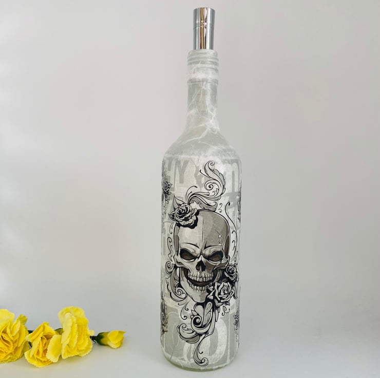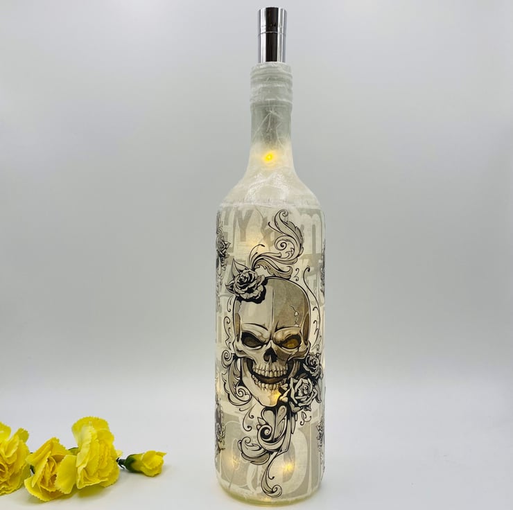 Introducing our captivating Decoupage Bottle with Lights, featuring a mesmerizing skull design. Perfect for adding a touch of macabre elegance to any space. The intricate decoupage technique brings the skull imagery to life, while the subtle glow of the lights creates a hauntingly beautiful ambiance. Whether you're a fan of gothic decor or simply looking to make a statement, this decoupage bottle will surely become a conversation starter. Display it as a centerpiece, delight your guests, or offer it as a memorable gift for your fellow skull enthusiasts. Truly a unique creation, this decoupage bottle with lights will add an enchanting and mysterious touch to your home decor.