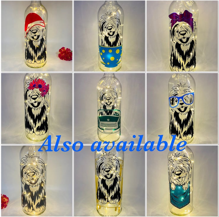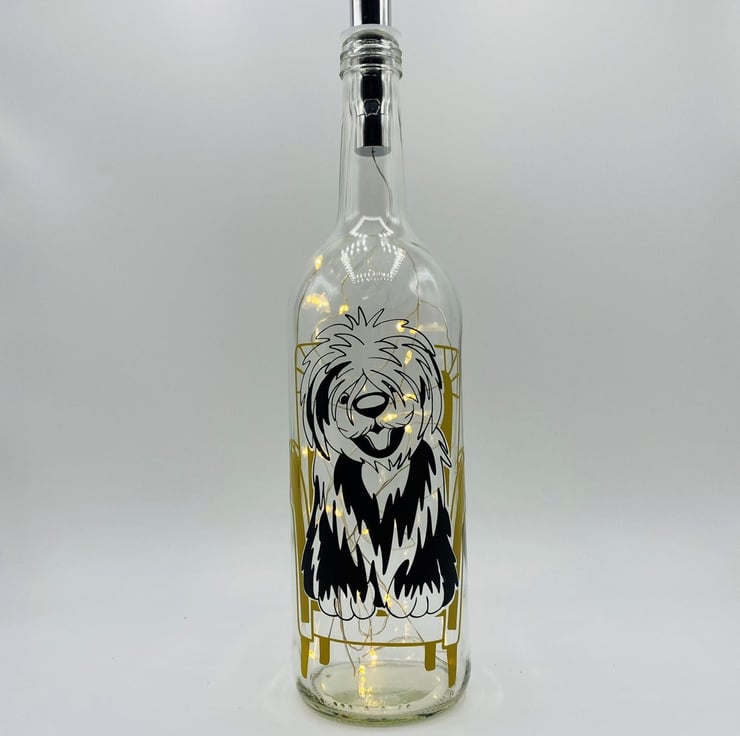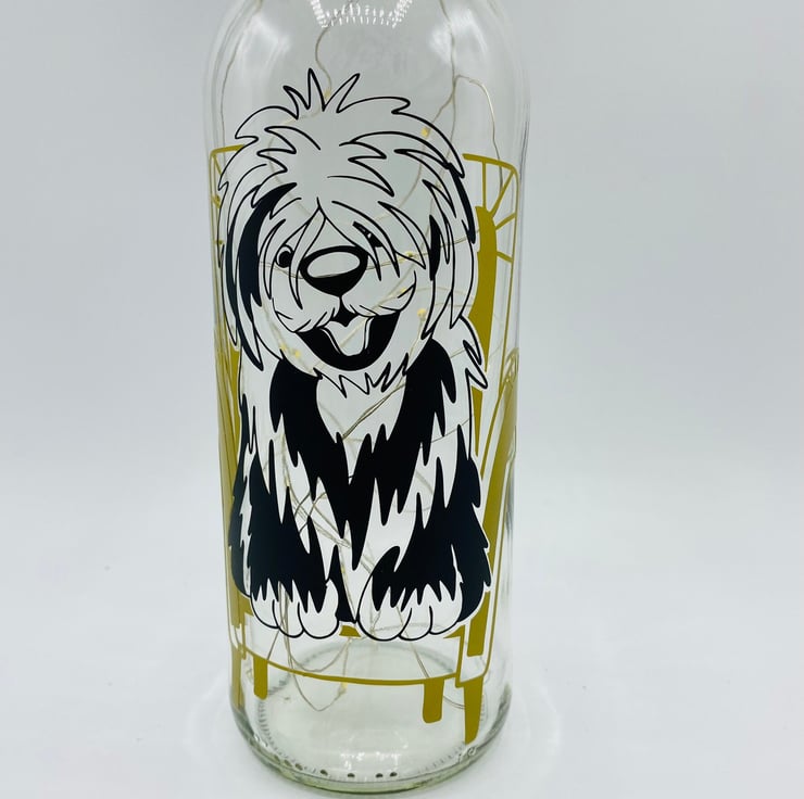This is a clear wine bottle decorated with a vinyl Old English Sheepdog (OES) sitting in a chair. Ideal for OES mum and dads.
