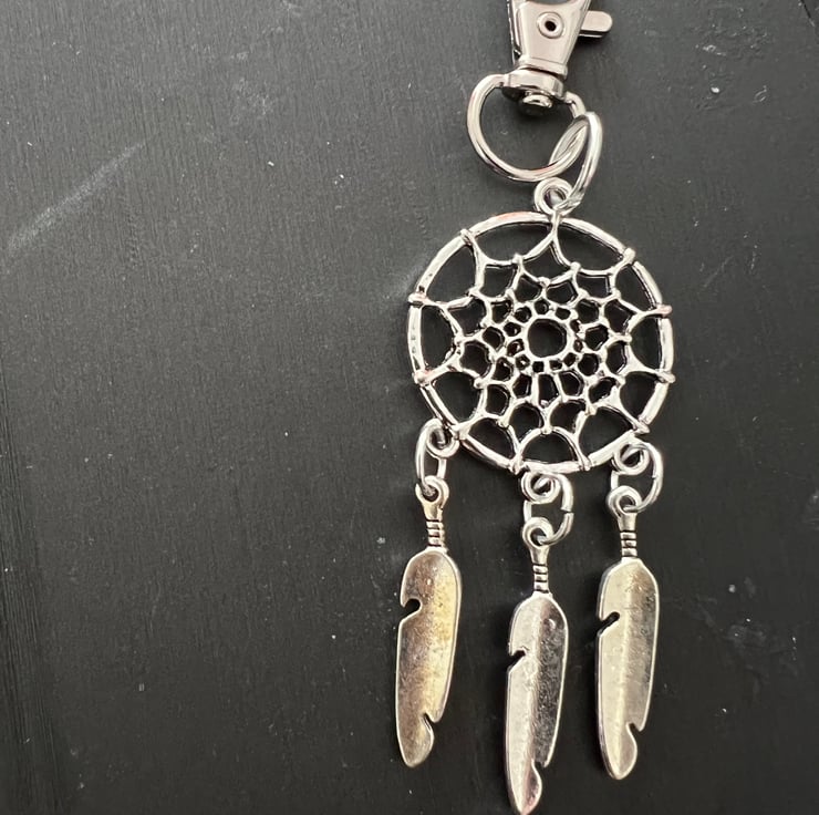 The dreamcatcher is made of Tibetan silver as are the feathers, which are two turquoise Blue and one red and are attached to a lobster clasp to be attached to your bag or purse.