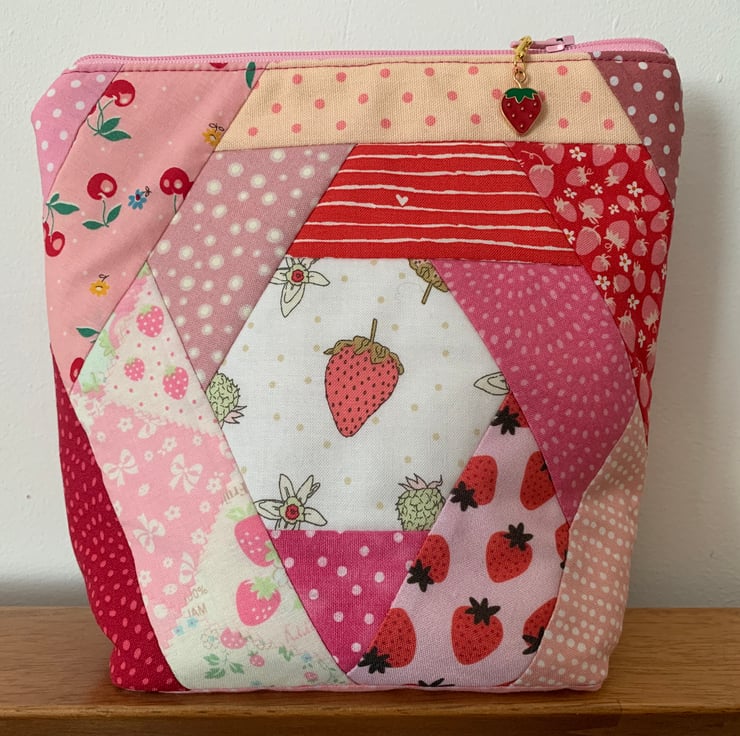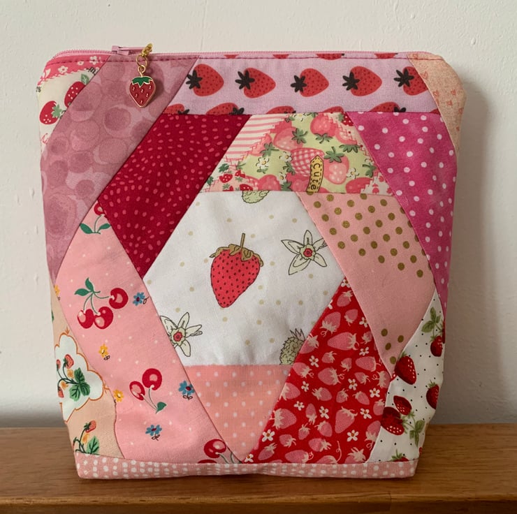 Very cute make up or art bag with the strawberry design. Lined inside. 18 cm height, 20 cm width, 7 cm depth. 100% cotton and it is backed with fusible interface. Cute strawberry enamel zipper charm.
