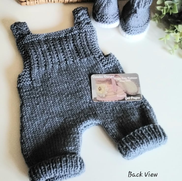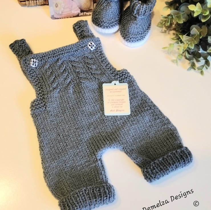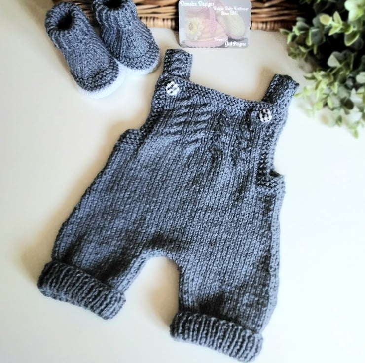 A lovely cosy baby boys rompers and booties set designed by Demelza Designs. The set has been hand knitted to exceptionally high standards using quality soft machine washable acrylic yarns. The buttons are made from genuine wood with a check design on them. The booties have a pipe design sole edge to give a shoe/boot shape on the feet during wear.
