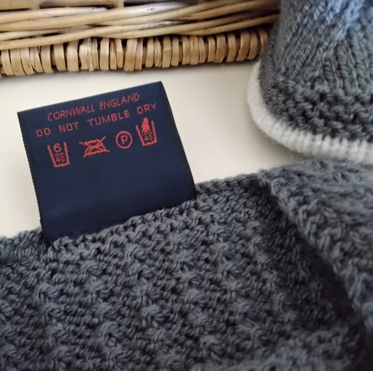 Baby knitwear is designed and hand crafted by Demelza Designs in Cornwall meeting UK baby safety standards, Only branded premuim acylic, acrylic/natural fibre blends or pure natural fibre yarns are used in baby knitwear which conforms to BS984/76 standards.