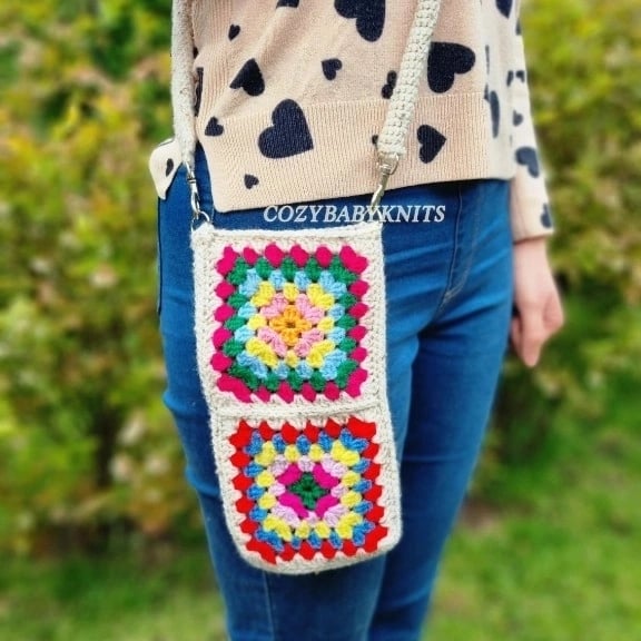Crossbody phone bag with removable strap. Made with granny squares and has a gusset so can be used for your phone and also a small wallet/keys.