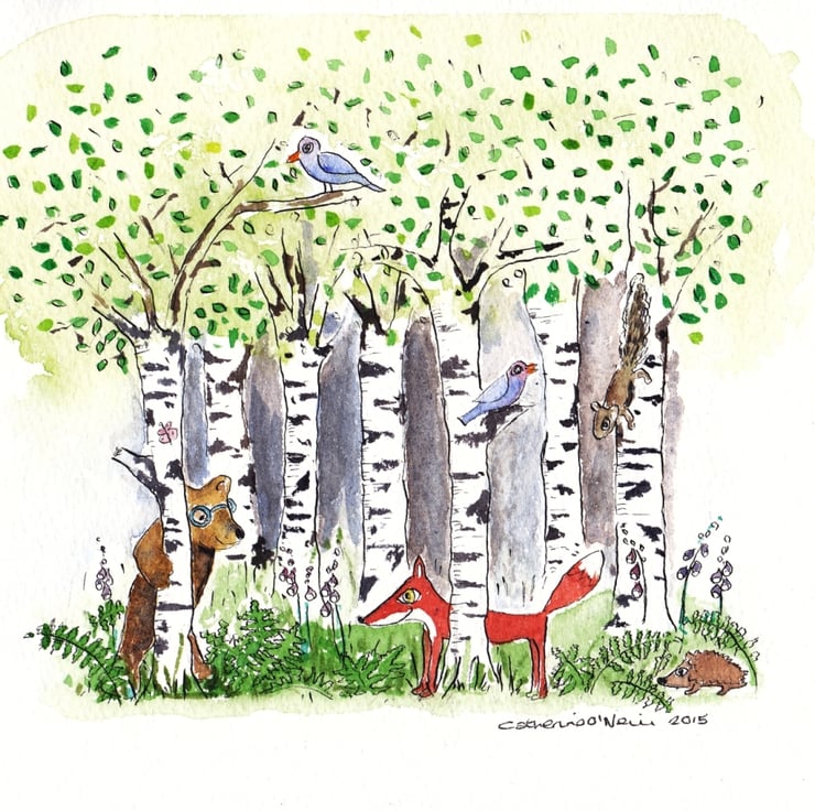 A original watercolour and ink drawing of little forest animals playing a game of hide and seek.