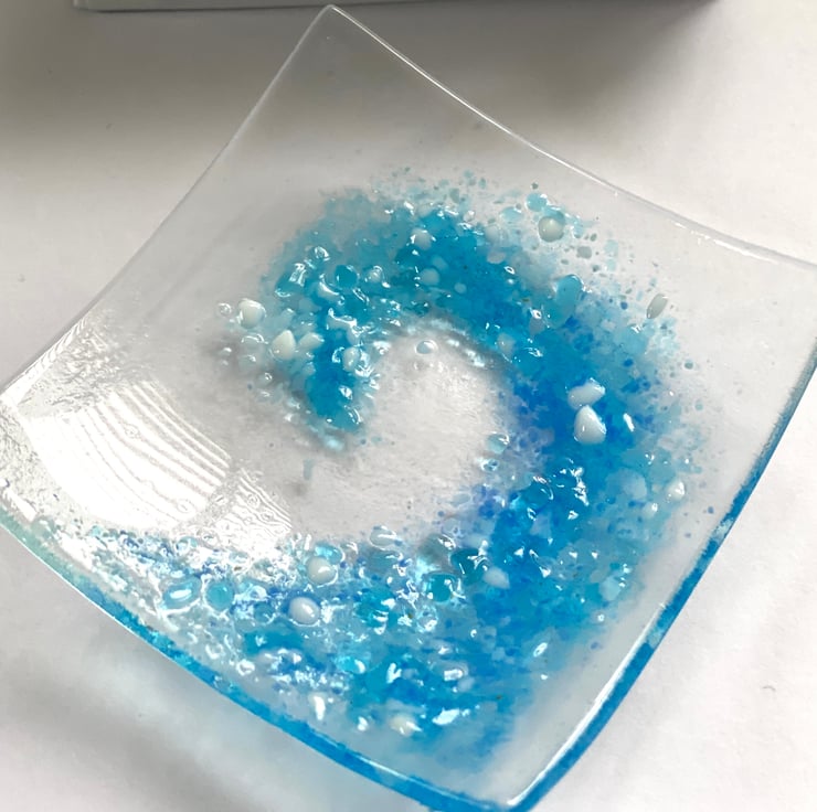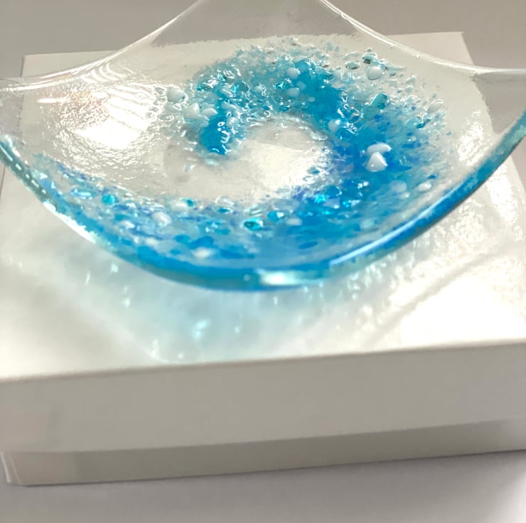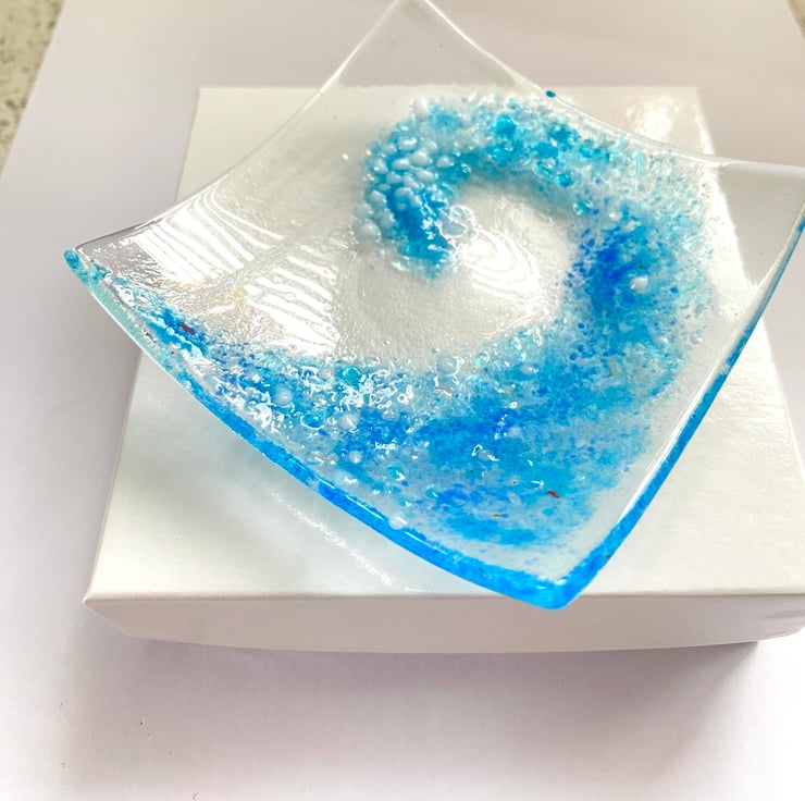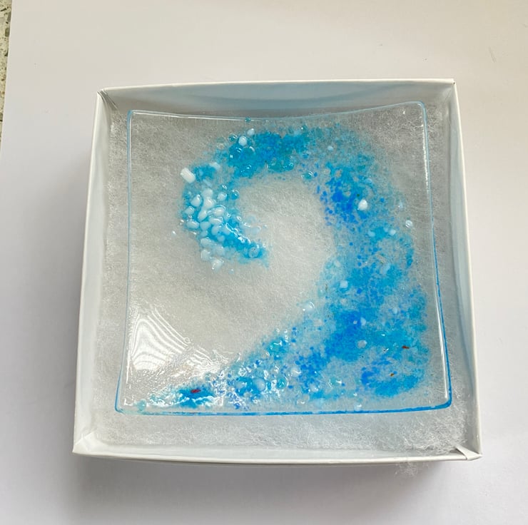 Pretty hand crafted fused glass wave trinket dish which comes in a gift box. The glass wave dish is a perfect small gift for sea lovers - perfect for safely storing small jewellry items or just a decorative piece of glass art. Dish dimensions approximately 3 inch square with a gentle curve . The wave design is created using fused glass powders .