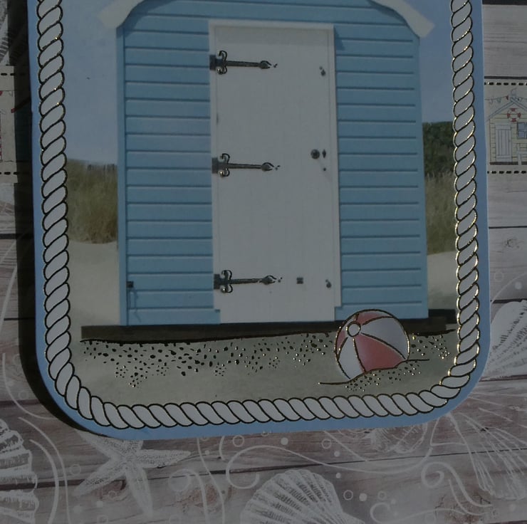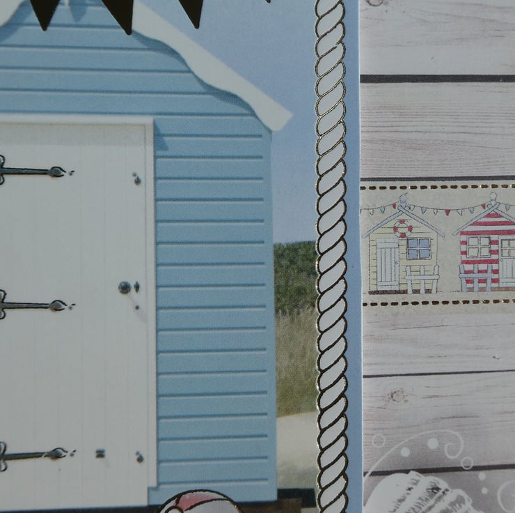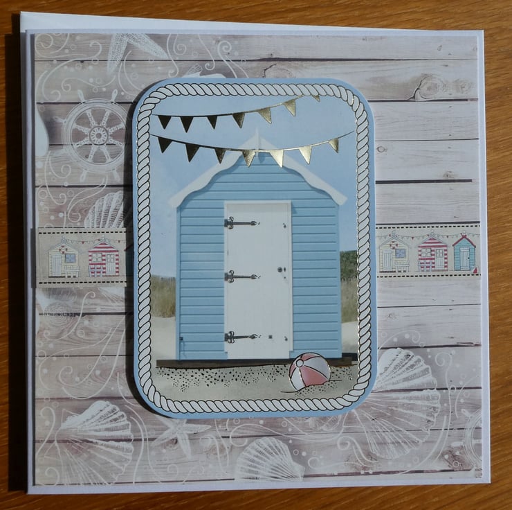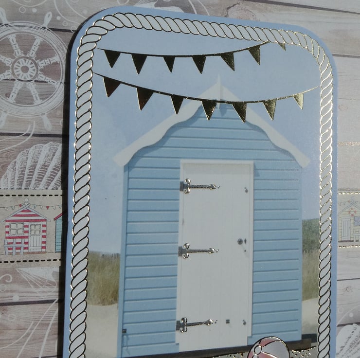 A central printed image of a pastel blue beach hut with a white door and eves, a beach ball and gold foiled bunting is slightly raised on foam pads.